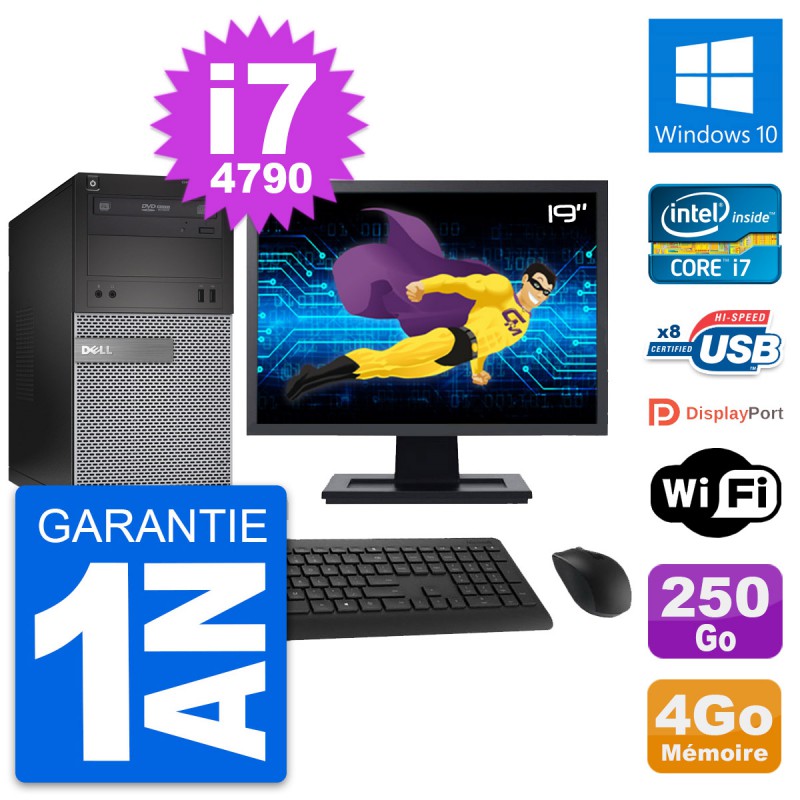PC Tour Dell 3020 Ecran 19" Intel i7-4790 RAM 4Go Disque 250Go Windows 10 Wifi