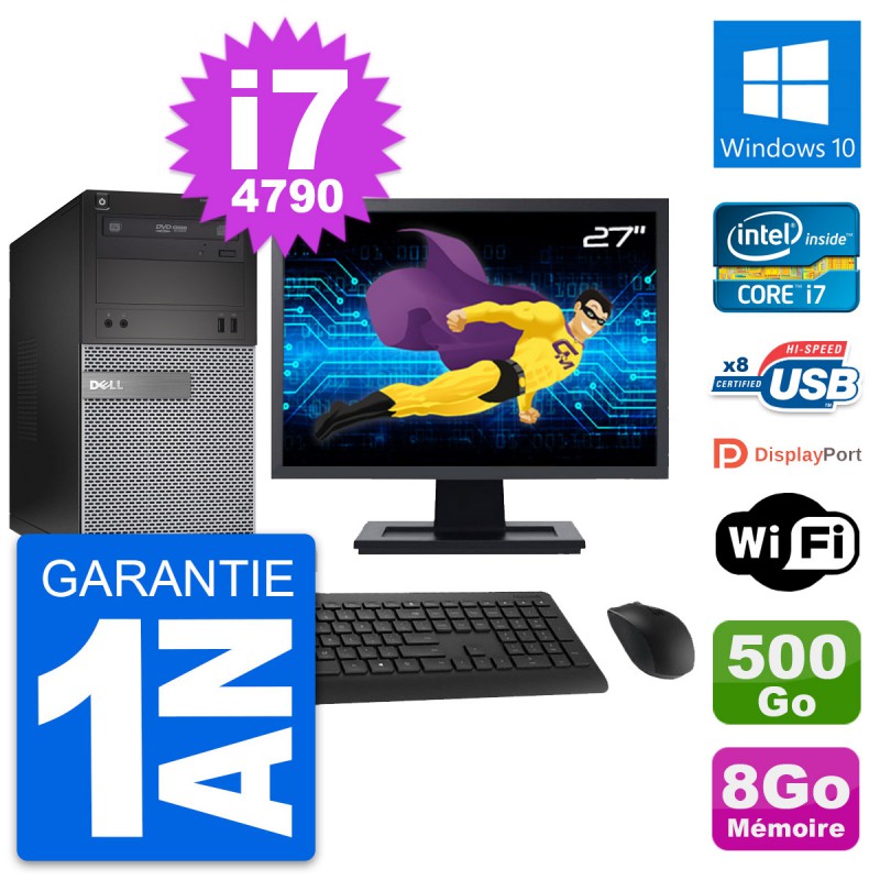 PC Tour Dell 3020 Ecran 27" Intel i7-4790 RAM 8Go Disque 500Go Windows 10 Wifi