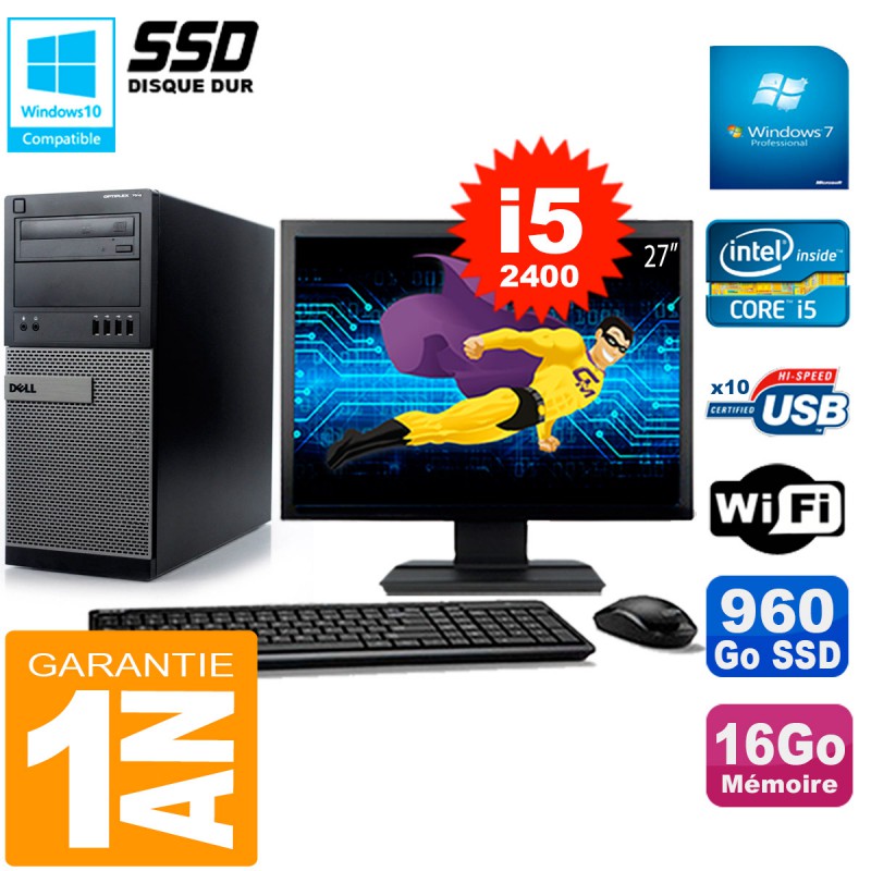 PC Tour DELL 7010 Ecran 27" Core I5-2400 RAM 16Go Disque 960 Go SSD Wifi W7