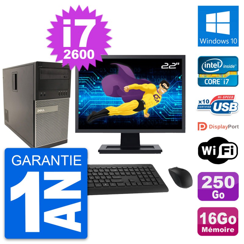 PC Tour Dell 790 MT Ecran 22" Core i7-2600 RAM 16Go Disque 250Go Windows 10 Wifi