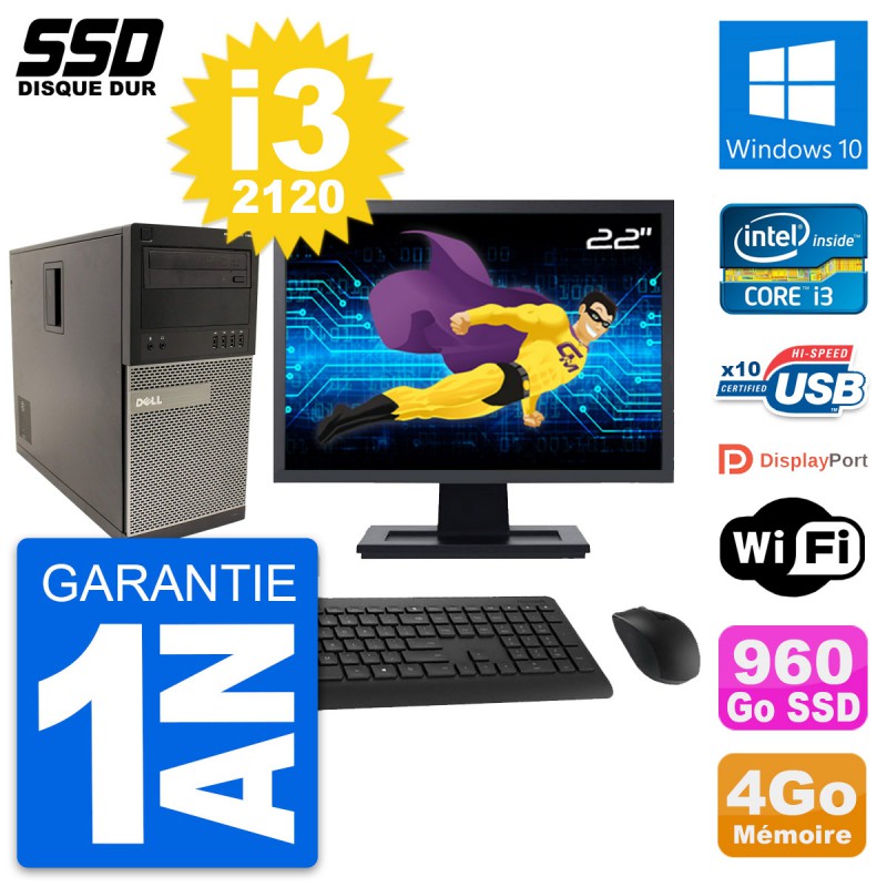 Libellé PC Tour Dell 790 MT Ecran 22" Intel i3-2120 RAM 4Go SSD 960Go Windows 10 Wifi
