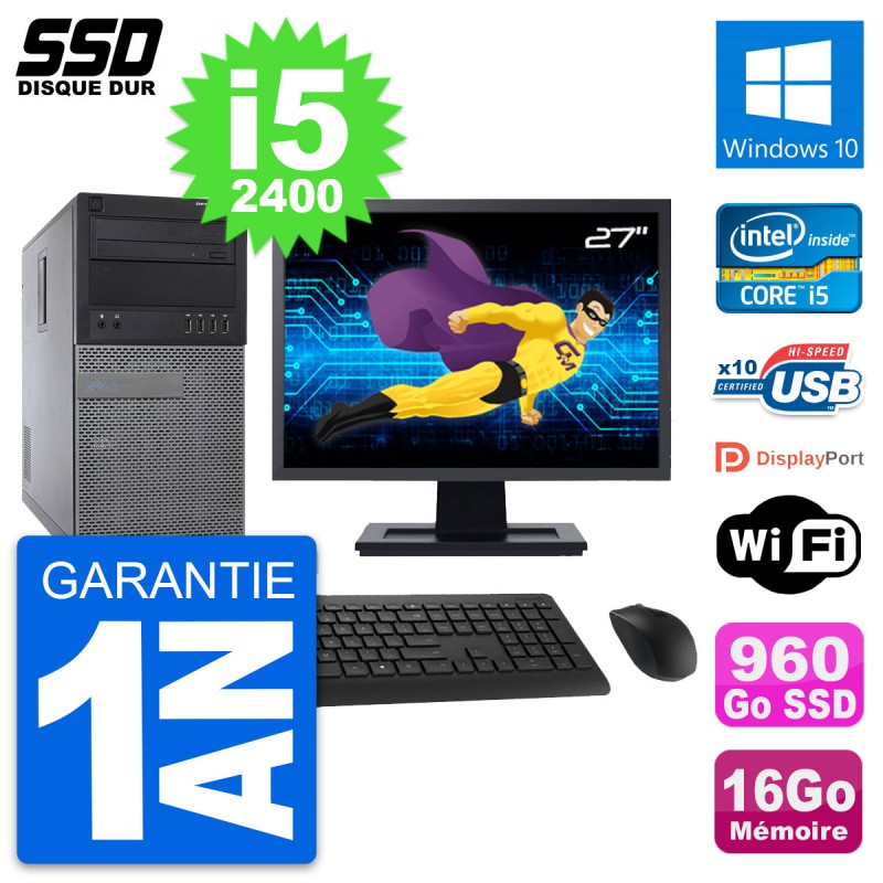 PC Tour Dell 790 MT Ecran 27" Intel i5-2400 RAM 16Go SSD 960Go Windows 10 Wifi