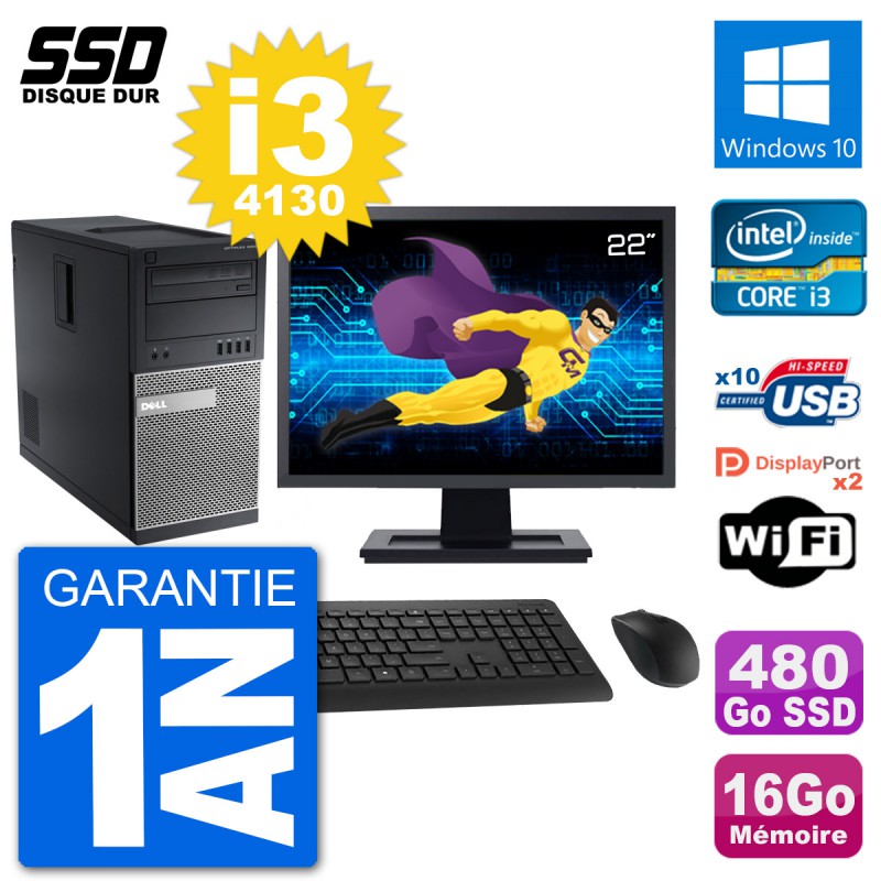 PC Tour Dell 9020 Ecran 22" Intel i3-4130 RAM 16Go SSD 480Go Windows 10 Wifi