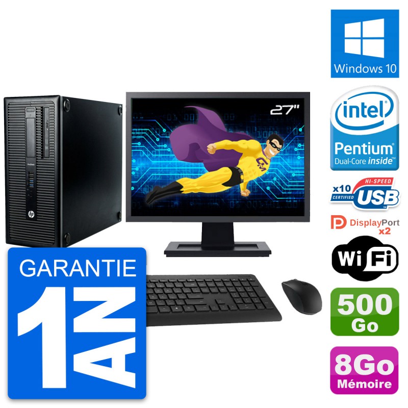 Libellé PC Tour HP 600 G1 Ecran 27" Intel G3220 RAM 8Go Disque 500Go Windows 10 Wifi