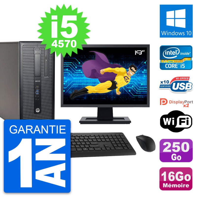 PC Tour HP 800 G1 Ecran 19" Intel i5-4570 RAM 16Go Disque 250Go Windows 10 Wifi