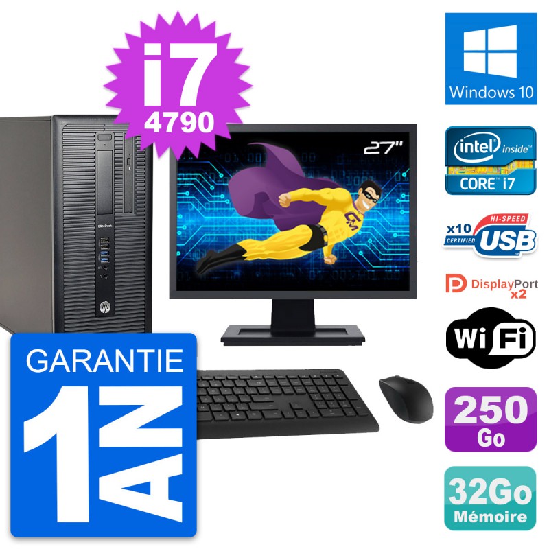 PC Tour HP 800 G1 Ecran 27" Intel i7-4790 RAM 32Go Disque 250Go Windows 10 Wifi