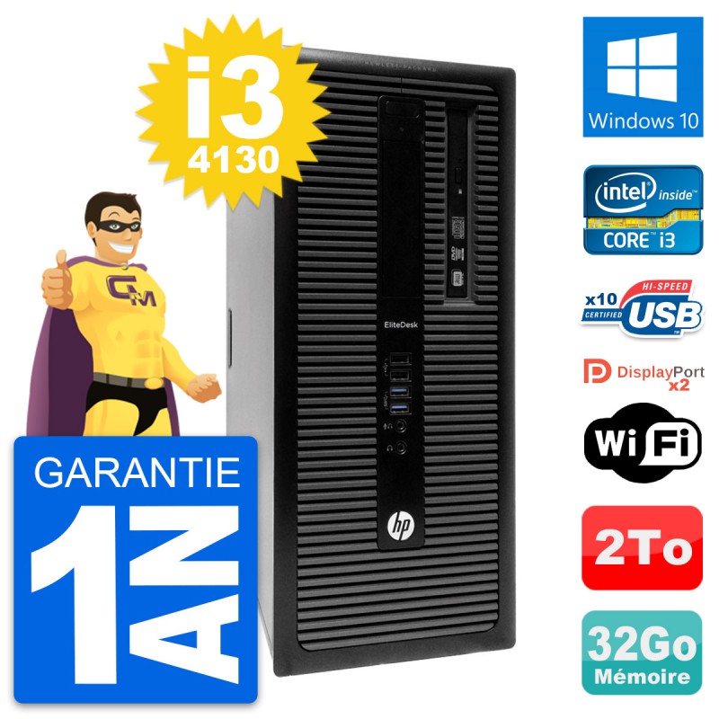 | Libellé | PC Tour HP EliteDesk 800 G1 Intel i3-4130 RAM 32Go Disque 2To Windows 10 Wifi |