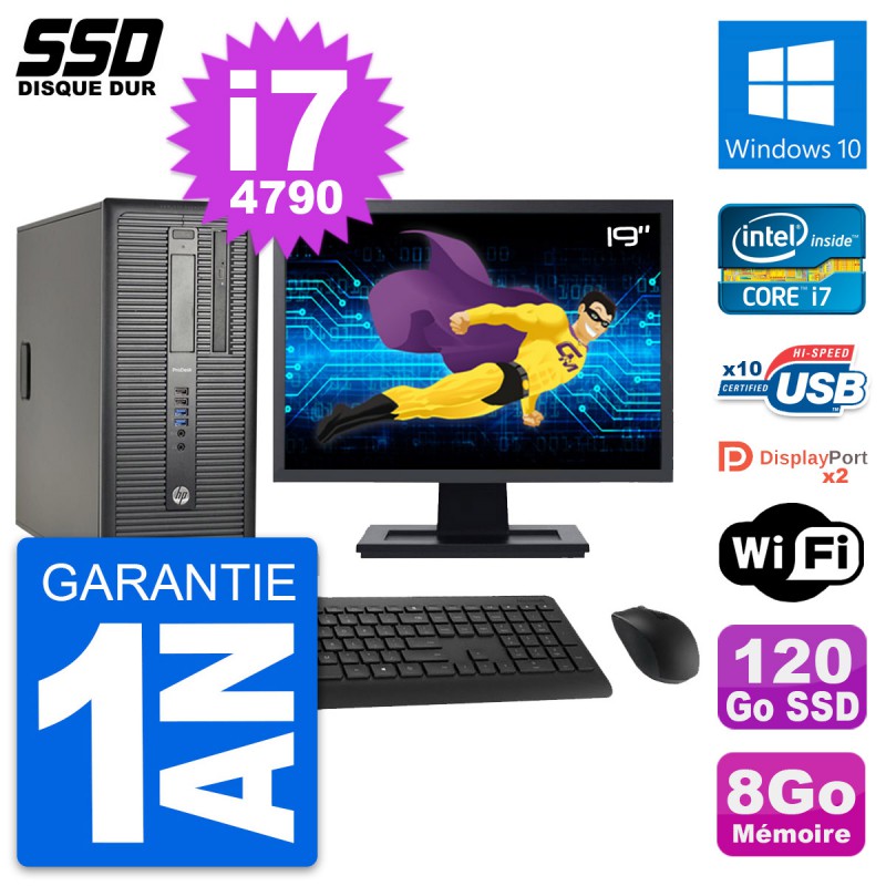 Libellé PC Tour HP ProDesk 600 G1 Ecran 19" i7-4790 RAM 8Go SSD 120Go Windows 10 Wifi