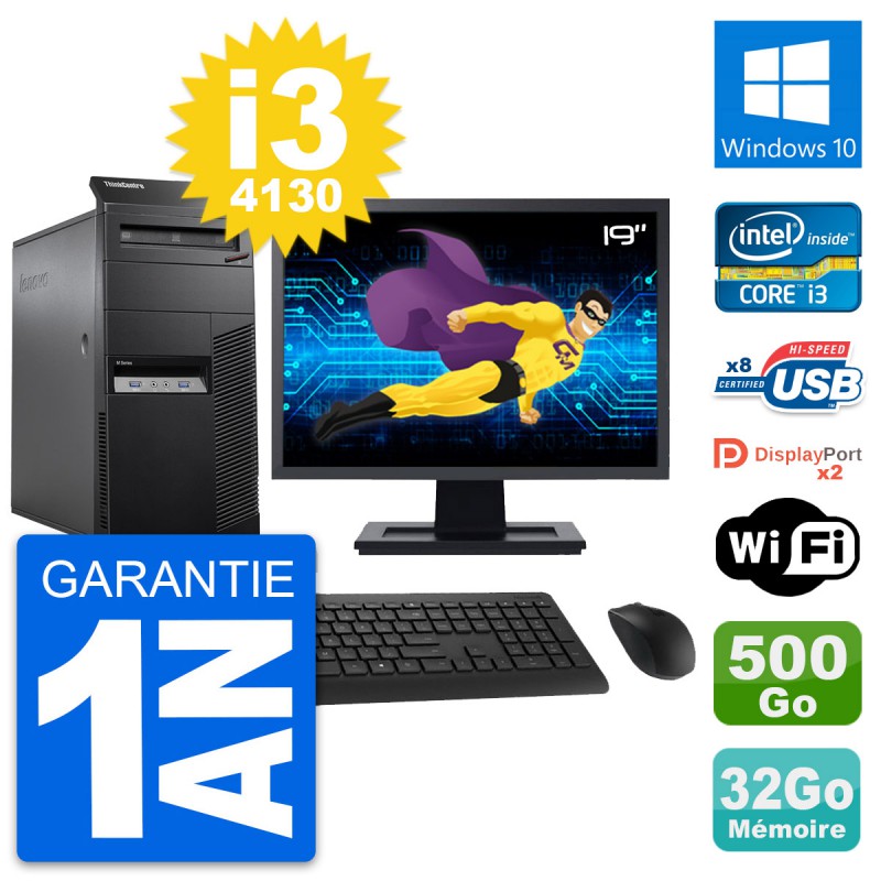 PC Tour Lenovo M83 Ecran 19" Intel i3-4130 RAM 32Go Disque 500Go Windows 10 Wifi