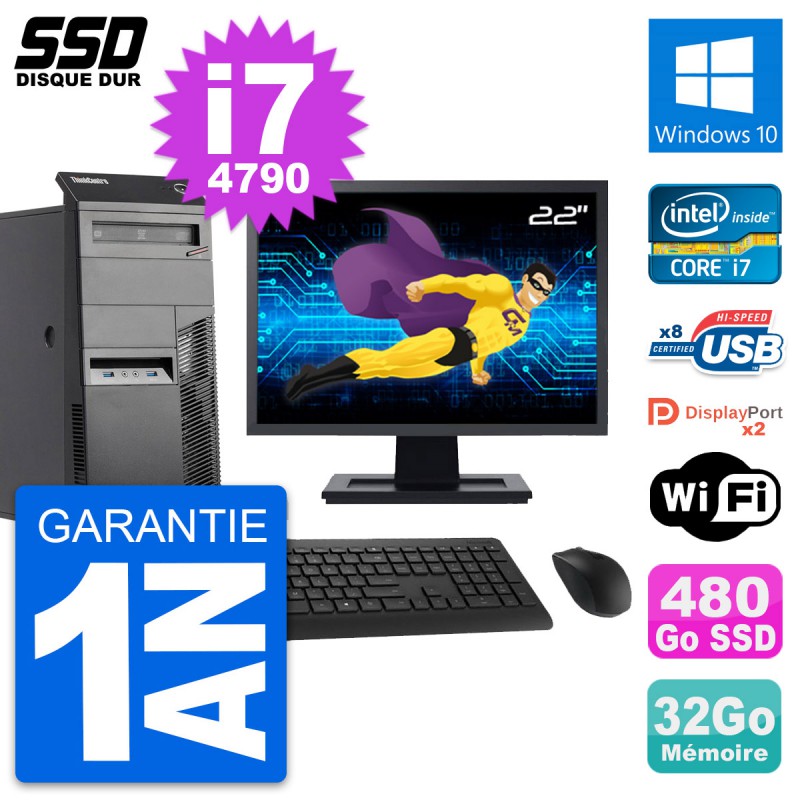| Libellé | PC Tour Lenovo M83 Ecran 22" Intel i7-4790 RAM 32Go SSD 480Go Windows 10 Wifi |