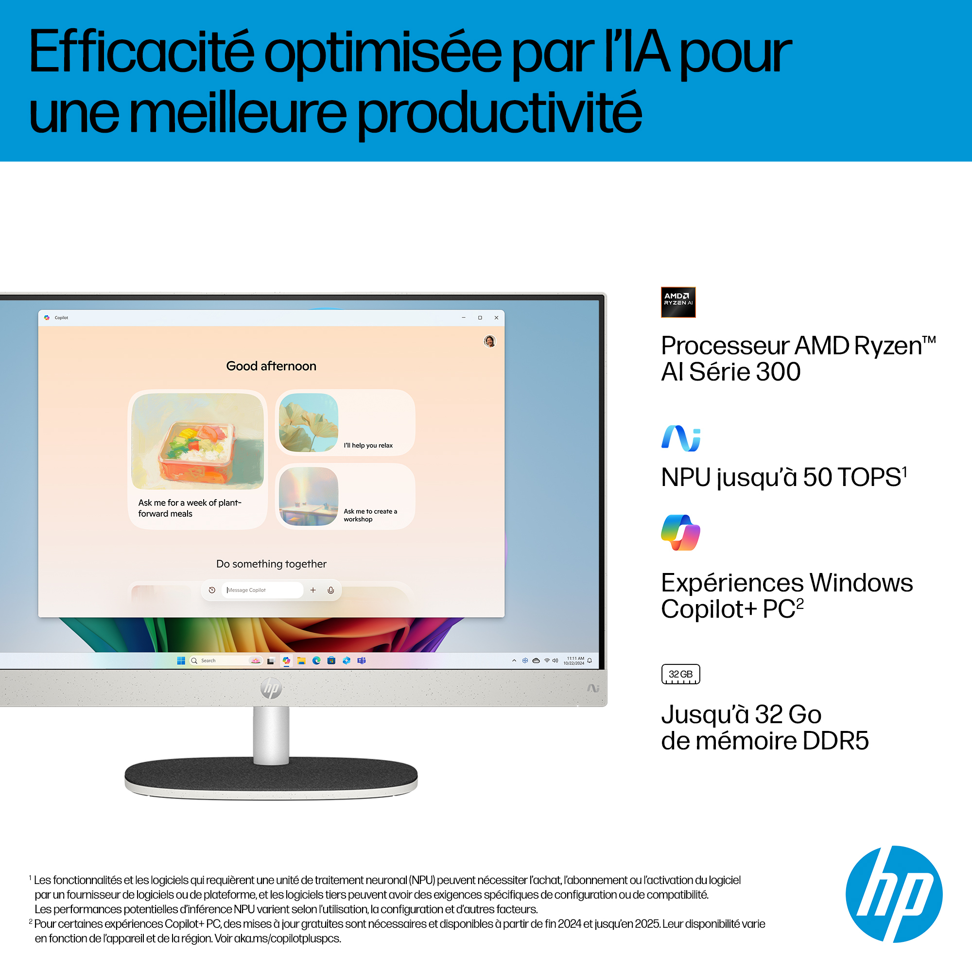 Boostez votre productivité et divertissez-vous avec le tout-en-un HP, équipé de processeurs AMD Ryzen™ AI Série 300 avec un NPU jusqu’à 50 TOPS[1] pour un traitement multitâche rapide et des performances optimisées par l’IA. Les outils intuitifs et l’assistant IA vous permettent de travailler intelligemment, tandis que la carte graphique AMD Radeon™ 800M offre des images d’une netteté époustouflante pour les jeux peu exigeants en ressources, le streaming et bien plus encore.
