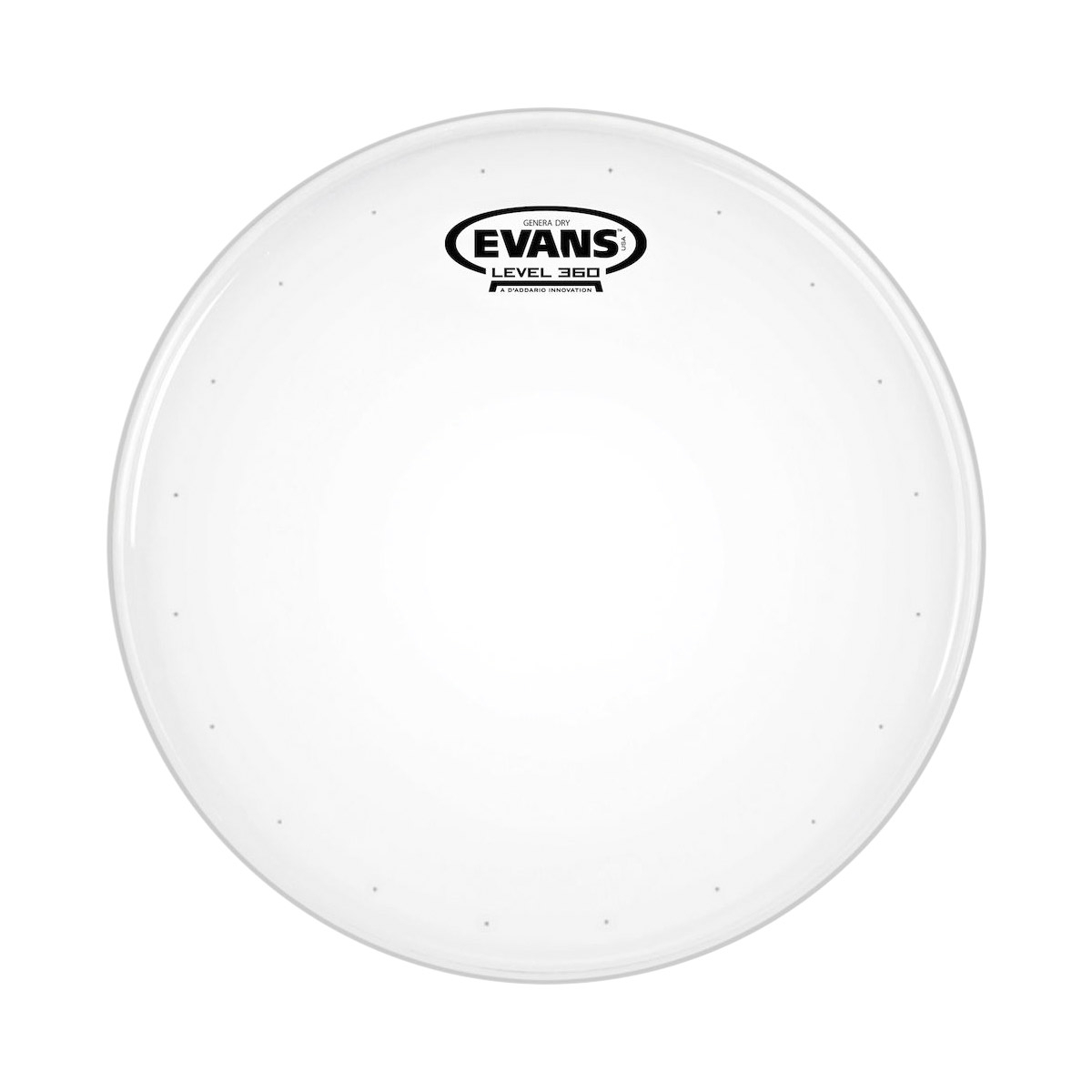 Peau EVANS GENERA DRY sablée pour caisse claire de 14 pouces (soit 35,56 cm). Sur la base d'une G1 sablée bien sur mais avec des petits trous appelés events de décompression et un muffler intégré. Tout cela dans le but d'éliminer les harmoniques parasites mais en gardant un son naturel et chaud. - Configuration: texture projetée (demi sablage) - Epaisseur: 2 plis (extérieur: 6,5 mil - intérieur: 10 mil). - Cercle en polyester "Edge Control" sur la face interne de la peau pour un contrôle total des harmoniques et les vibrations sans toutefois les éliminer. - Sonorité: chaude et grave - Résonance: mesurée et contrôlée - Applications: générales, scène ou studio, jazz, fusion Simple-pli et équipée d'un muffler interne, la Genera Dry possède des évents de décompression réduisant la résonance. - Configuration: blanche sablée, muffler interne, évents de décompression - Épaisseur: simple-pli: 10 mil - muffler: 2 mil - Sonorité: attaque ronde et précise - Résonance: réduite - Applications: studio, Rock, Jazz, Fusion
