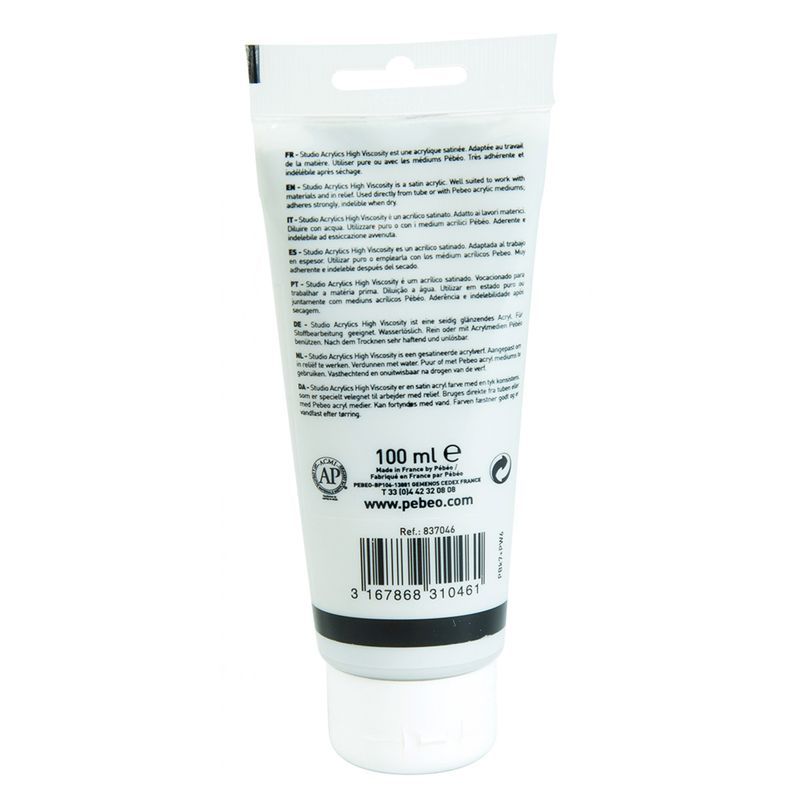 Acrylique satinée fabriquée avec la même rigueur que les acryliques extra fines. Elle s'utilise pure ou avec les mediums acryliques studio Pébéo selon les effets recherchés. Consistance épaisse adaptée au travail de la matière et utilisation au pinceau. Garde l'empreinte de l'outil. Laisser sécher loin de la poussière entre 30 minutes à 1 heure. La peinture est complètement sèche entre 1 et 4 jours selon l'épaisseur. Très adhérente, indélébile une fois sèche. Peut être appliqué sur toile, le carton et le bois (et la plupart des surfaces). Nettoyer les outils à l'eau savonneuse. La formulation des pâtes Studio High Viscosity et Fluid garantit l'absence de métaux lourds toxiques pour l'environnement.
