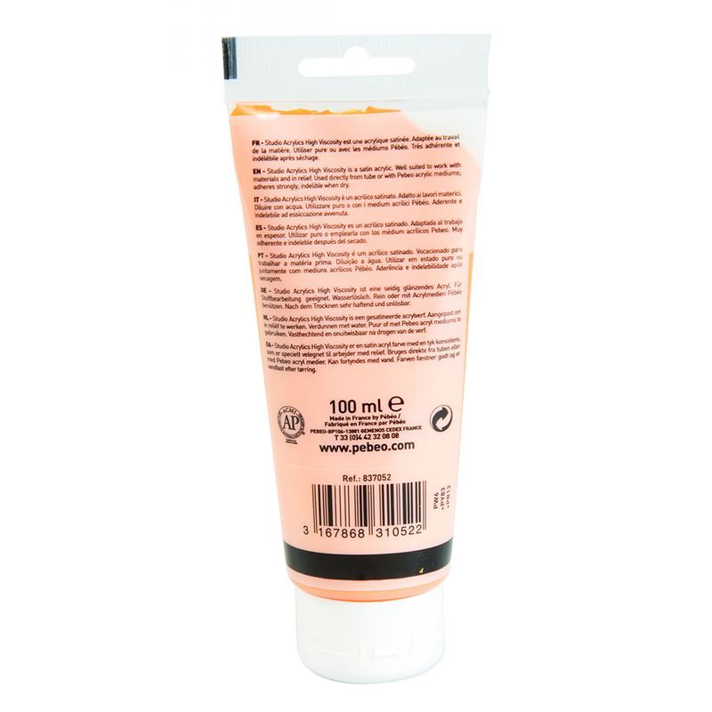 Acrylique satinée fabriquée avec la même rigueur que les acryliques extra fines. Elle s'utilise pure ou avec les mediums acryliques studio Pébéo selon les effets recherchés. Consistance épaisse adaptée au travail de la matière et utilisation au pinceau. Garde l'empreinte de l'outil. Laisser sécher loin de la poussière entre 30 minutes à 1 heure. La peinture est complètement sèche entre 1 et 4 jours selon l'épaisseur. Très adhérente, indélébile une fois sèche. Peut être appliqué sur toile, le carton et le bois (et la plupart des surfaces). Nettoyer les outils à l'eau savonneuse.