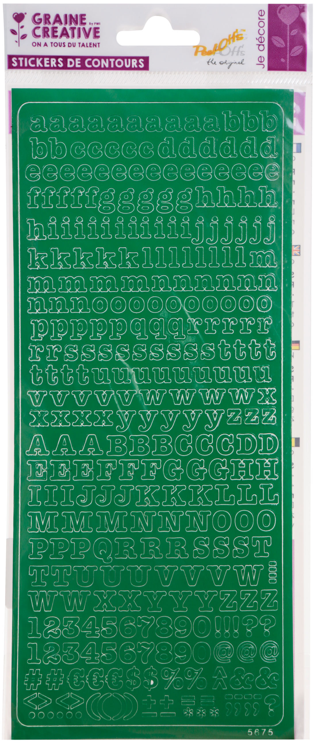 Les stickers de contour Peel Off's sont des autocollants fins et délicats qui s'appliquent sur une multitude de supports pour créer et décorer. Avec cette planche de stickers de l'alphabet couleur vert, vous pourrez réaliser vos cartes de vœux, vos faire-part et même les coller sur de la porcelaine ou du verre pour écrire les messages que vous voulez. La planche comporte 5 exemplaires de chaque lettre de l'alphabet, de couleur vert, en minuscule et en majuscule. La planche de stickers mesure 105x232mm.