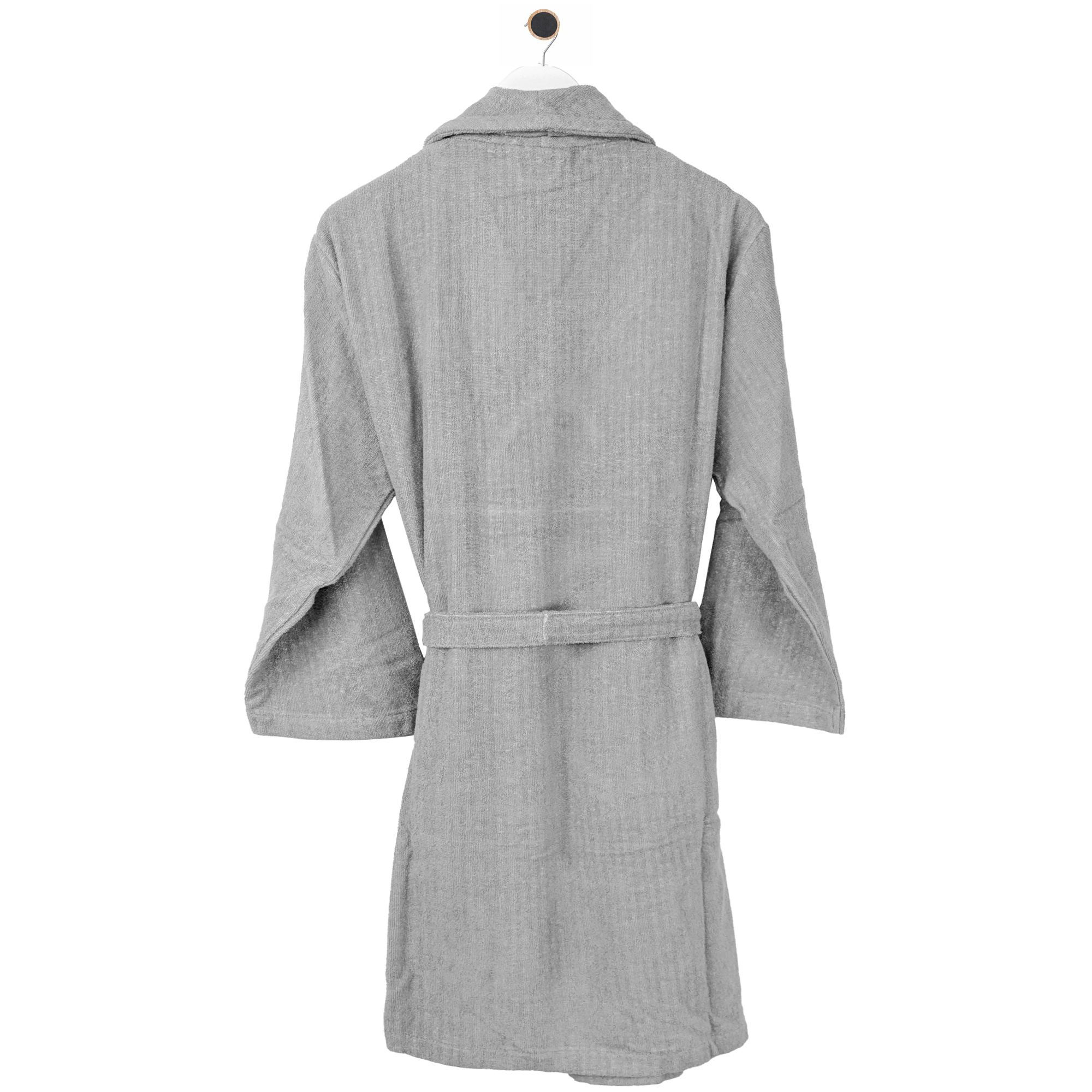 Collection unisexe de peignoirs de bain avec un col châle, dans un coloris gris Lunar uni, un grammage de 380 g/m2 et une finition ourlet piqué.