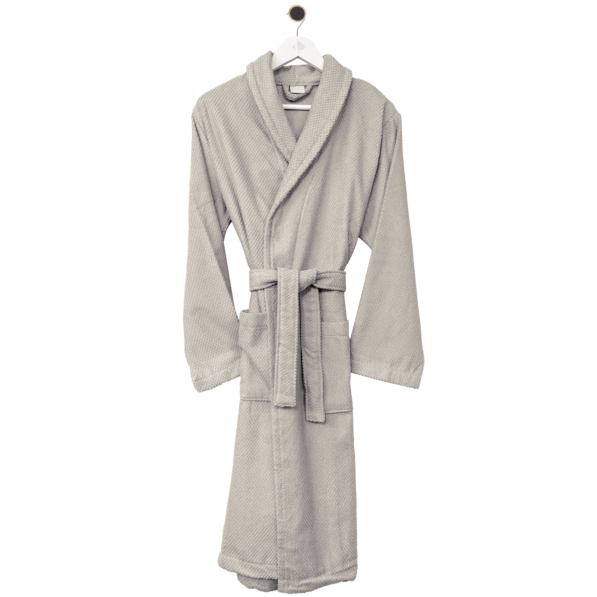 Peignoir adulte col châle, qui dispose également de deux poches extérieures plaquées à l'avant pour y glisser vos mains, ainsi qu'une ceinture à nouer pour un ajustement facile et adapté à votre goût. Une boucle d'accroche est présente à l'intérieur de l'encolure pour faciliter son rangement.