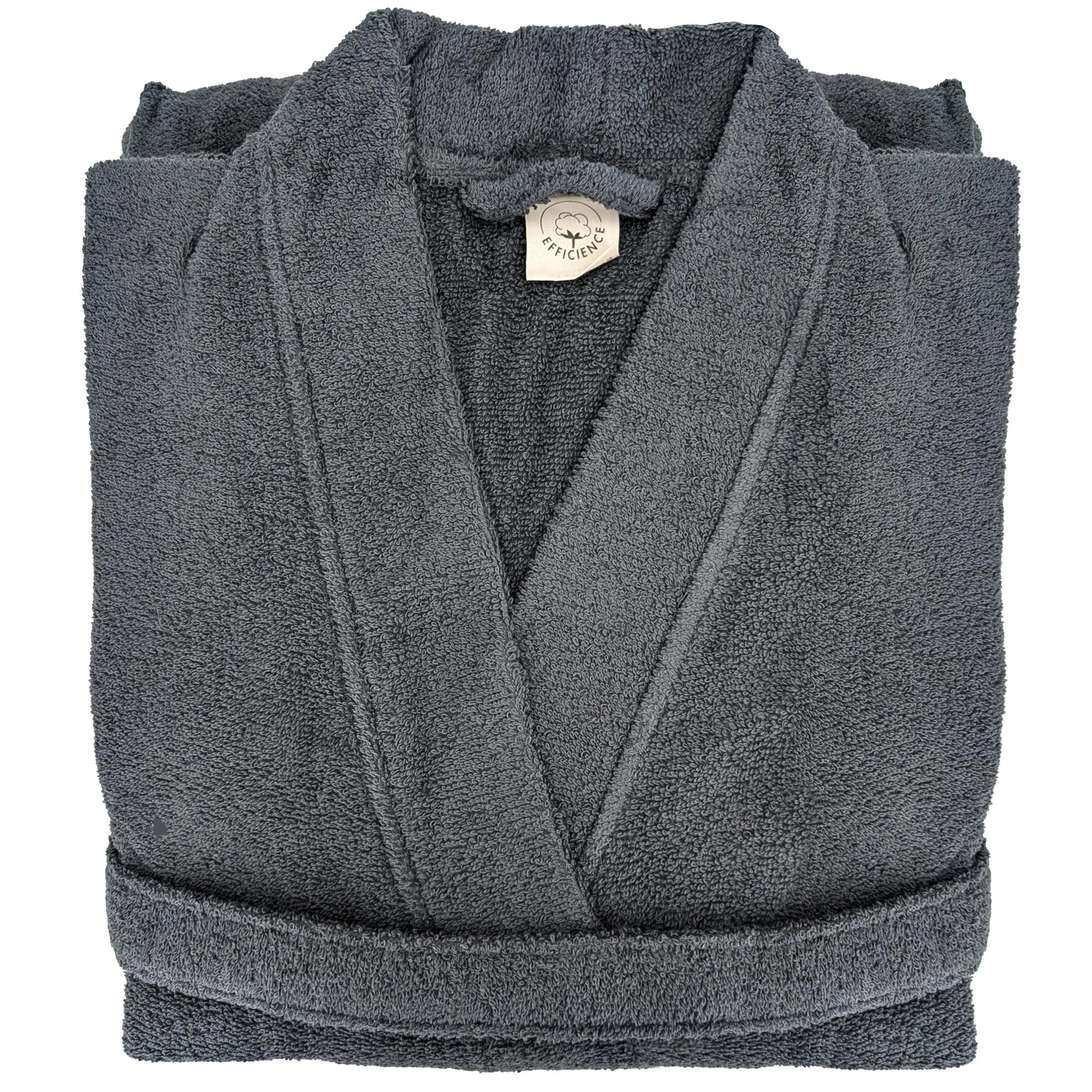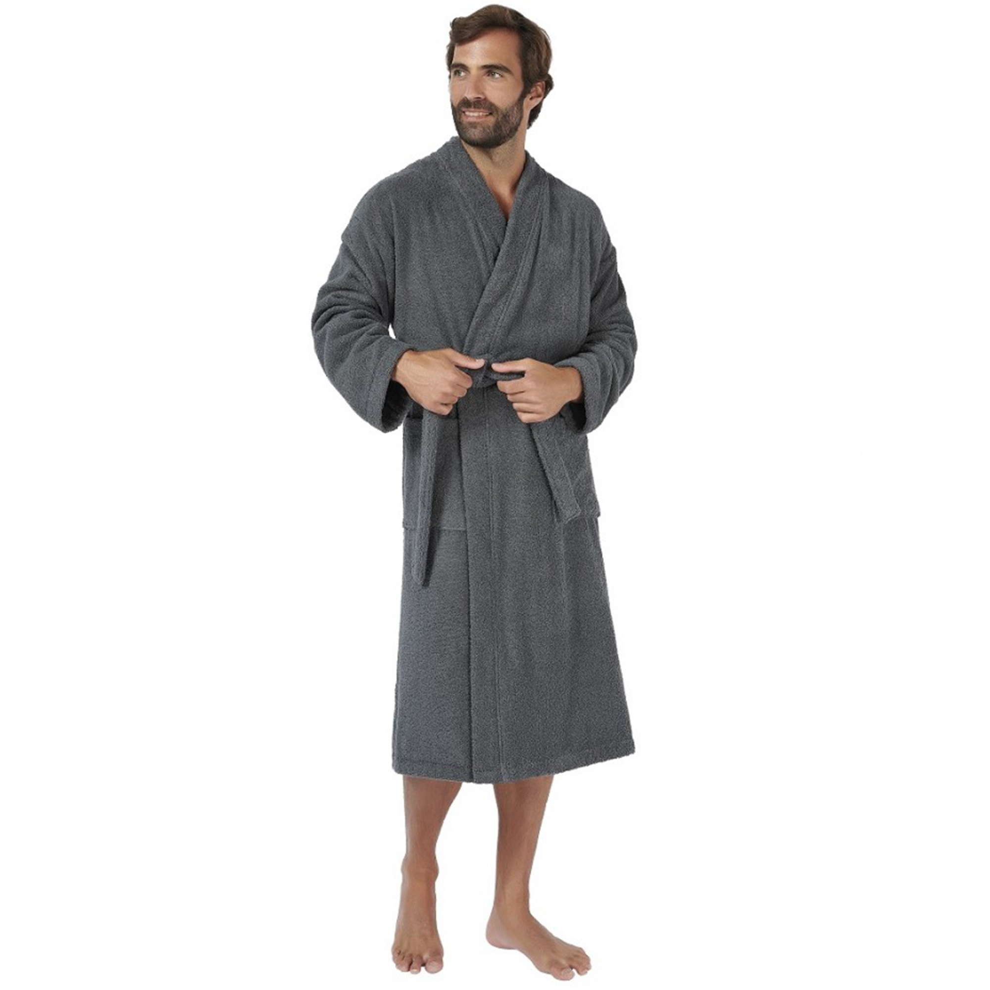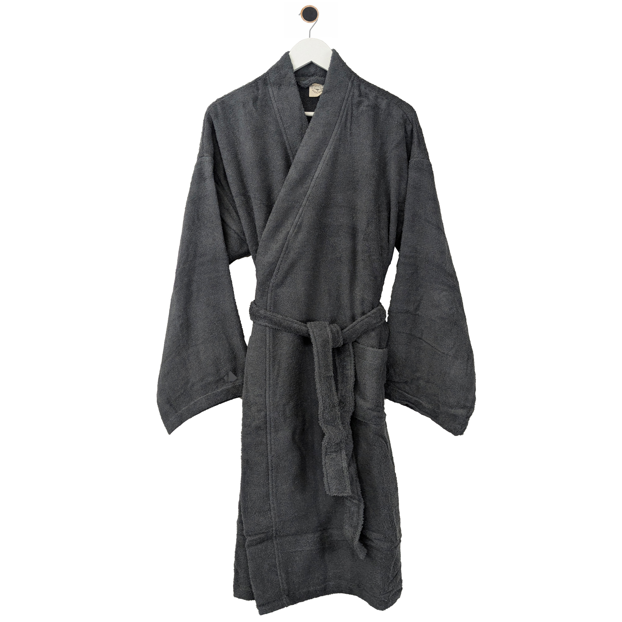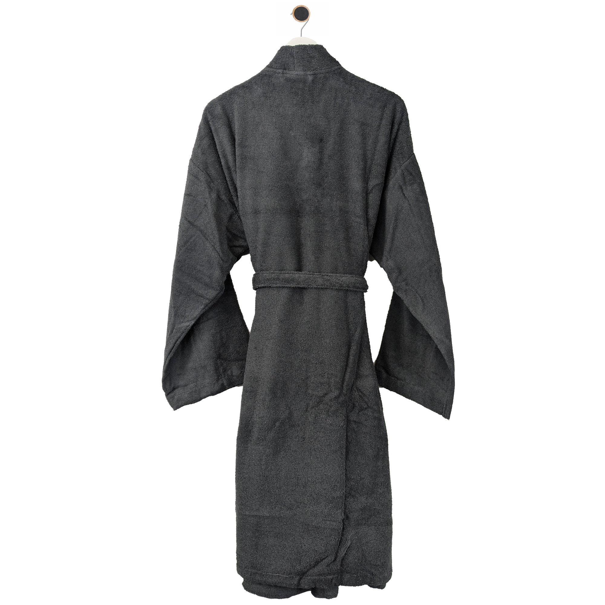 Collection unisexe de peignoirs de bain avec un col kimono, dans un coloris noir Iron uni, un grammage de 380 g/m2 et une finition ourlet piqué.