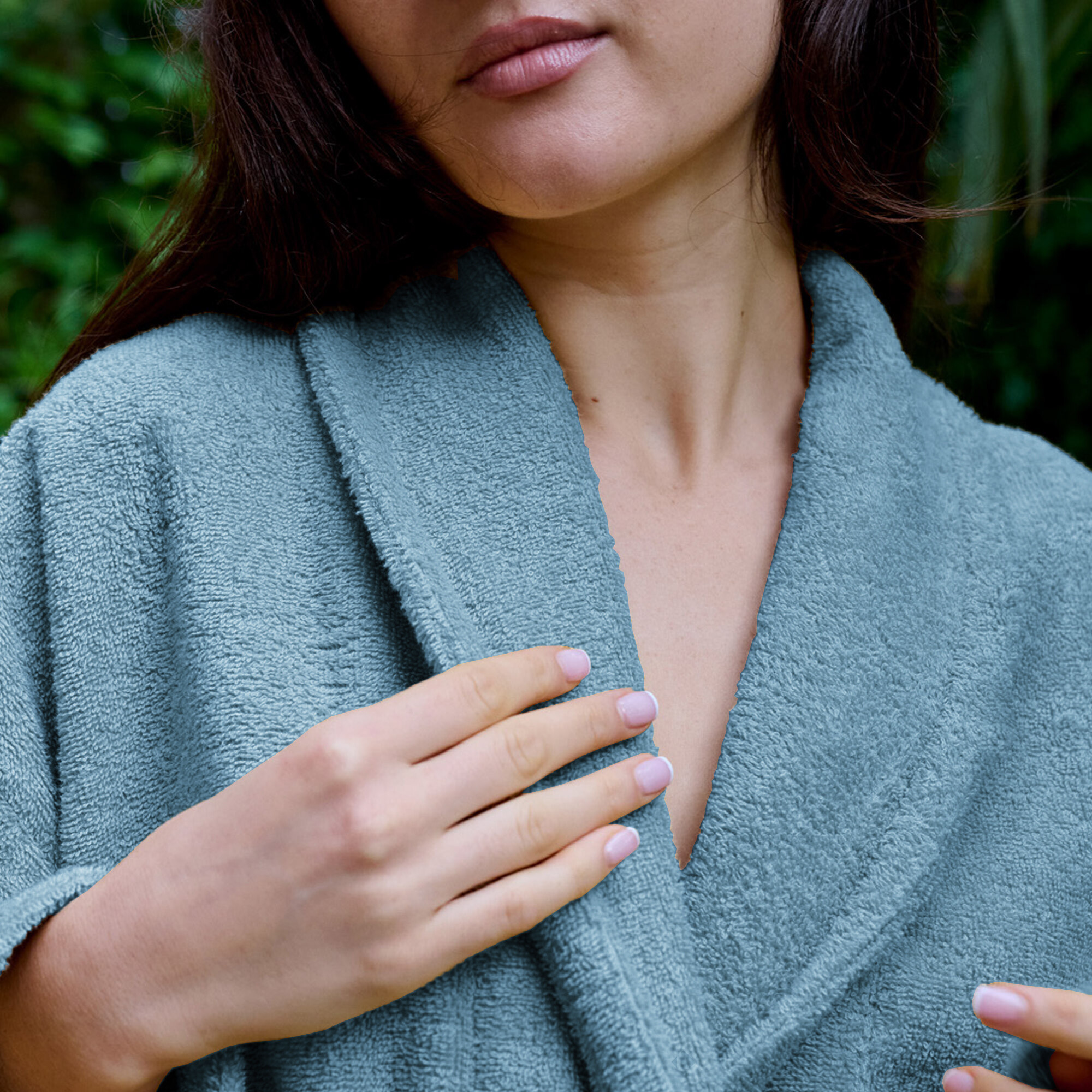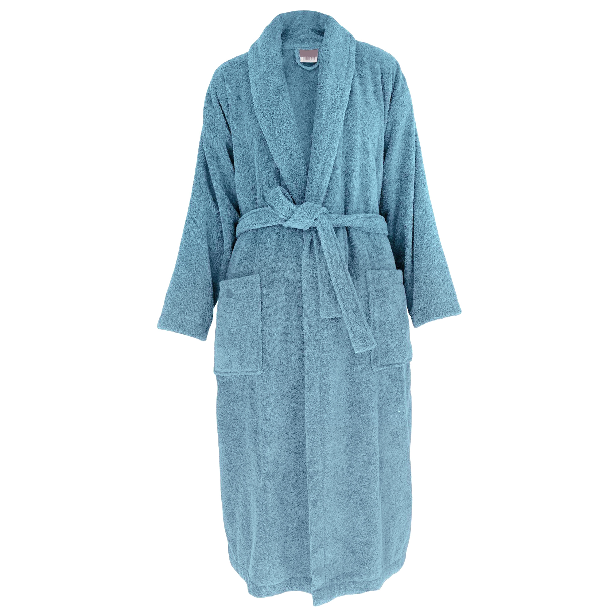 Un peignoir d'intérieur en coton épais, coloris cérulé, offrant douceur, chaleur et confort. Vous apprécierez ce peignoir unisex chic et confortable, idéale pour vous blottir dedans avec sa forme col châle bien enveloppante. Peignoir en coton naturel 380g/m2. Ceinture assortie qui se noue sous passants pour un cintrage facile et ajusté selon votre goût, et deux poches plaquées à l'avant.