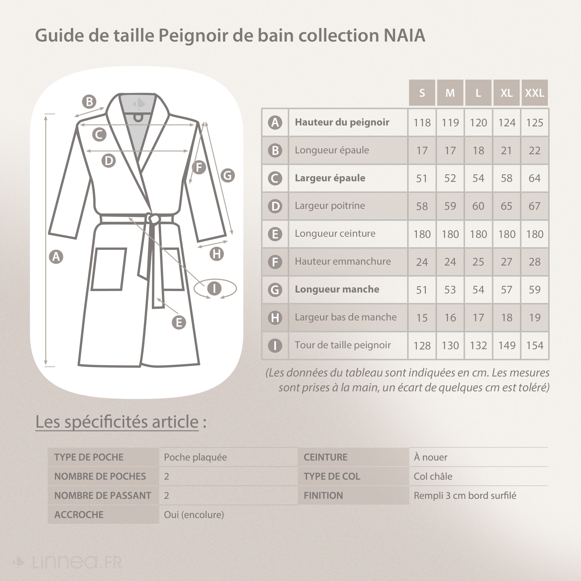 - Nous vous conseillons de choisir le peignoir en fonction de la largeur des épaules (C), de la longueur des manches (G) et de la longueur du peignoir (A). Cette collection de peignoirs est unisexe, les tailles conviennent aussi bien aux hommes qu'aux femmes. Selon votre morphologie et vos préférences, nous vous invitons à choisir la taille qui correspond à votre style, que vous portiez le peignoir ample ou près du corps.