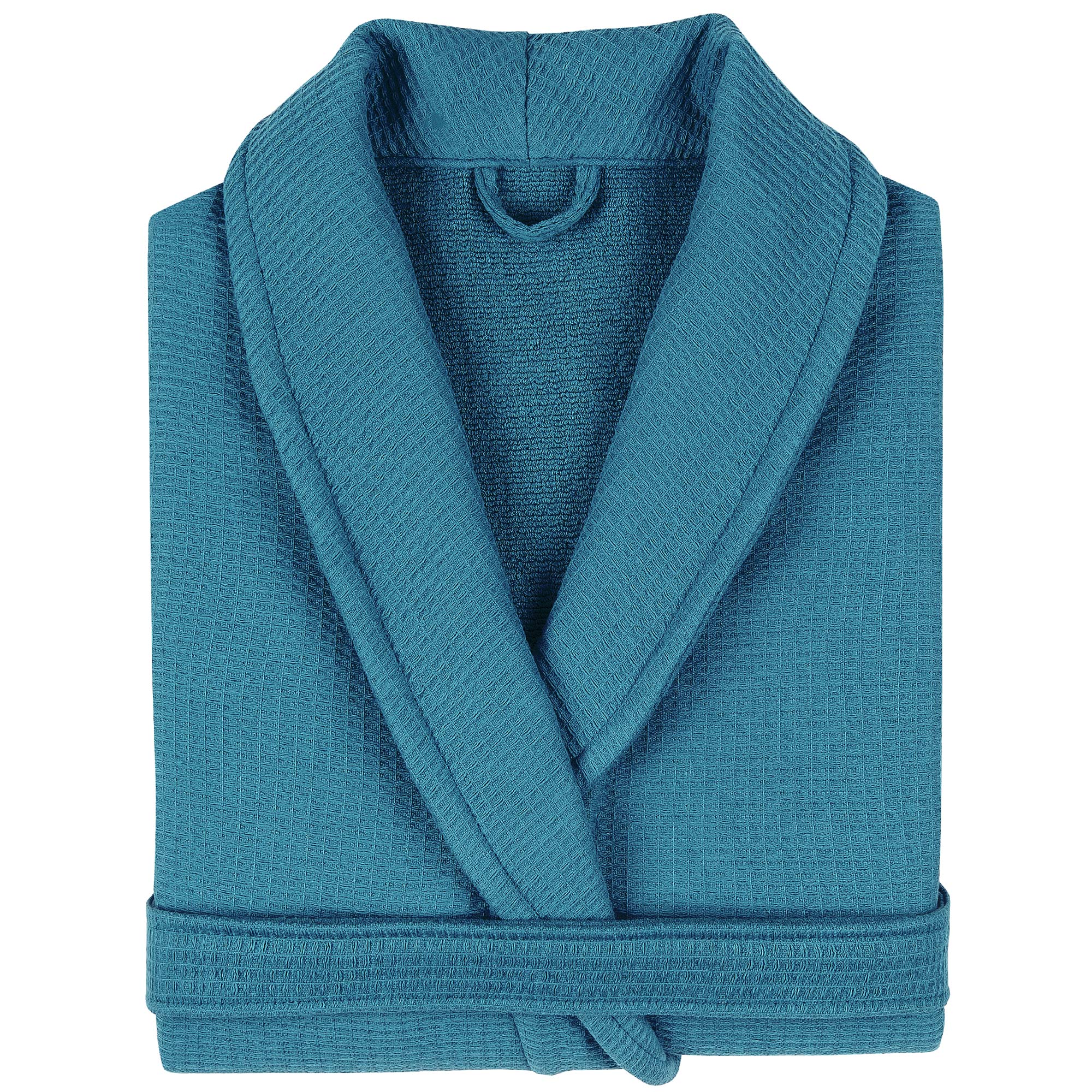 Un peignoir adulte au style épuré, en pur coton bio Gots, éponge aspect nid d'abeille et une face intérieure bouclette éponge. Collection unisexe de peignoirs de bain avec un col châle, collection NATURAL, dans un coloris bleu Canard uni, un grammage de 400 g/m2 et une finition ourlet piqué.