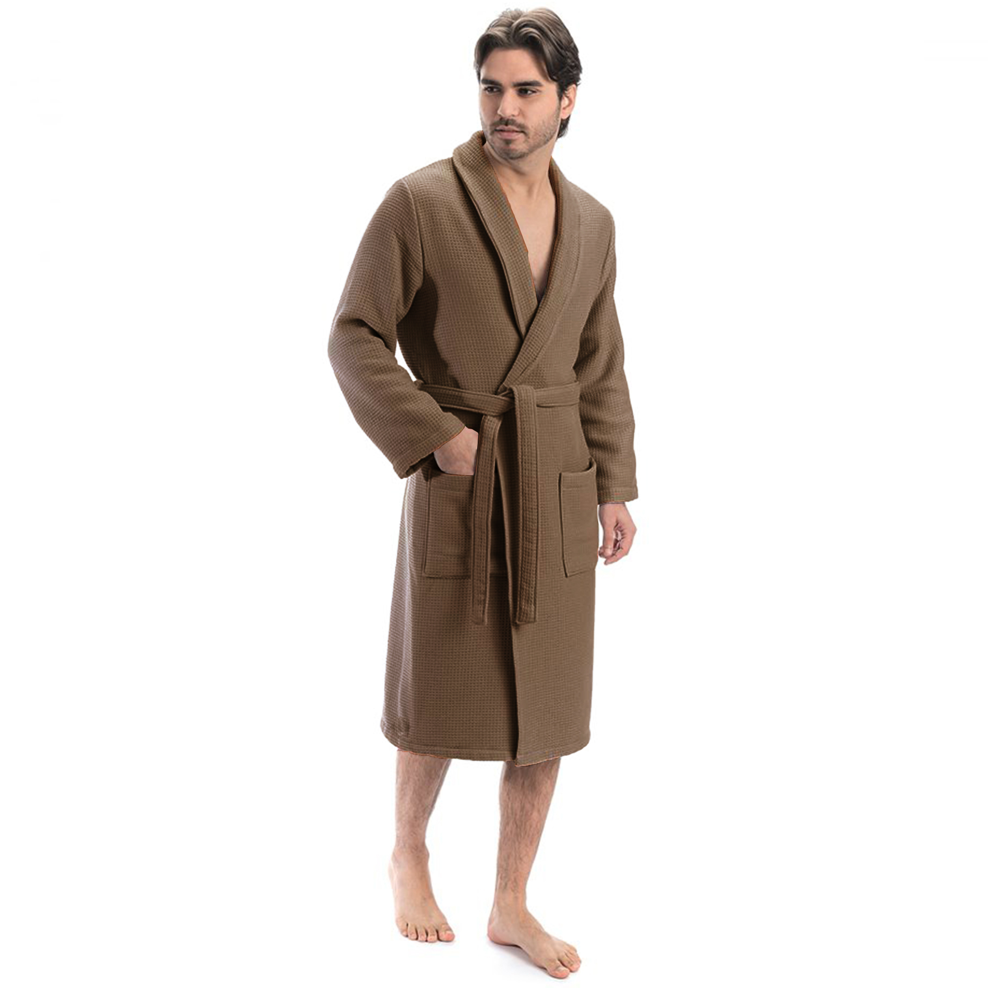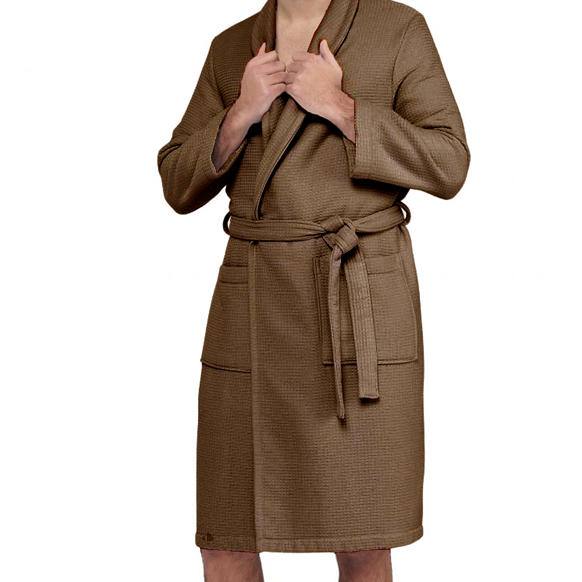 Un peignoir adulte au style épuré, en pur coton bio Gots, éponge aspect nid d'abeille et une face intérieure bouclette éponge. Collection unisexe de peignoirs de bain avec un col châle, collection NATURAL, dans un coloris Marron uni, un grammage de 400 g/m2 et une finition ourlet piqué.