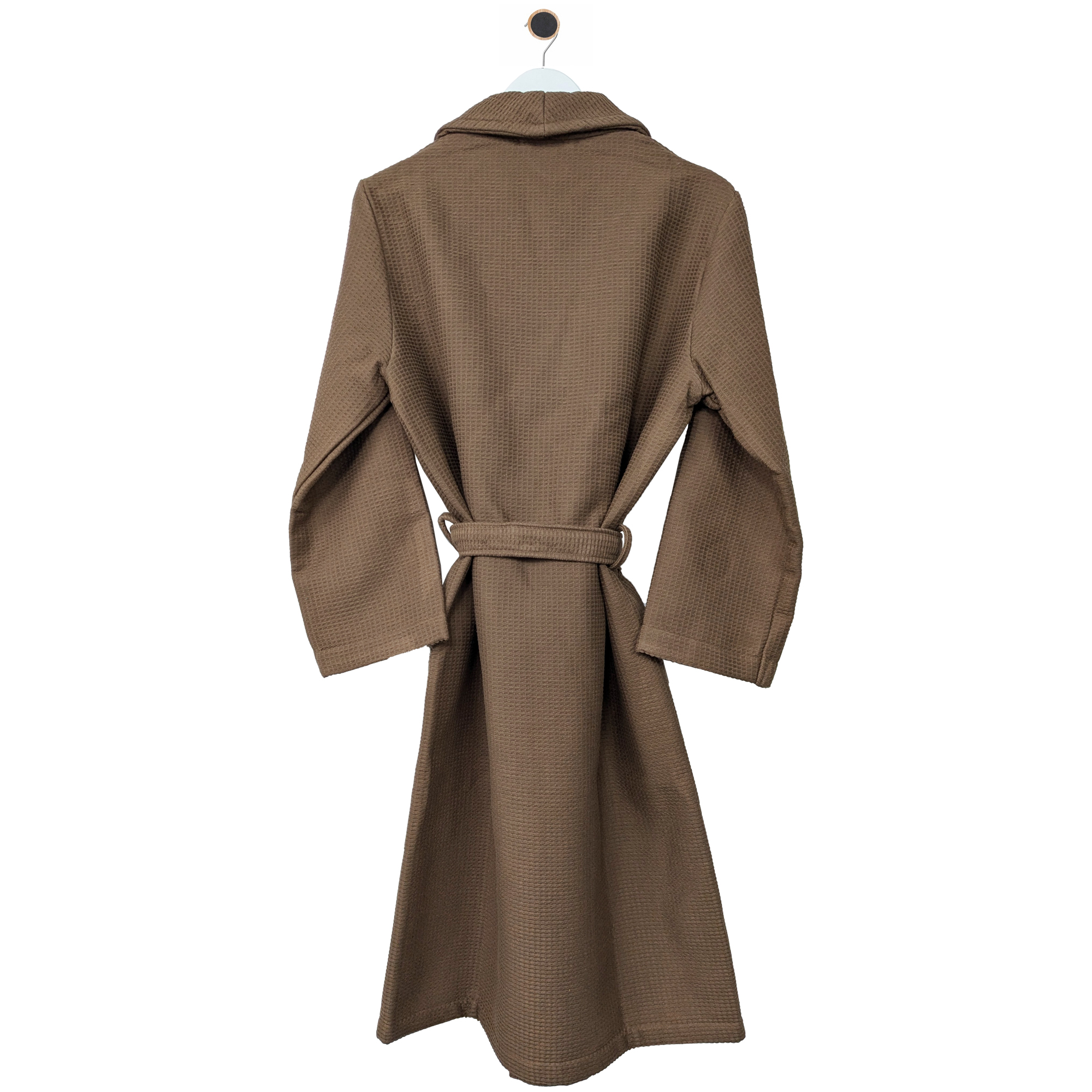 Un peignoir adulte au style épuré, en pur coton bio Gots, éponge aspect nid d'abeille et une face intérieure bouclette éponge. Collection unisexe de peignoirs de bain avec un col châle, collection NATURAL, dans un coloris Marron uni, un grammage de 400 g/m2 et une finition ourlet piqué.