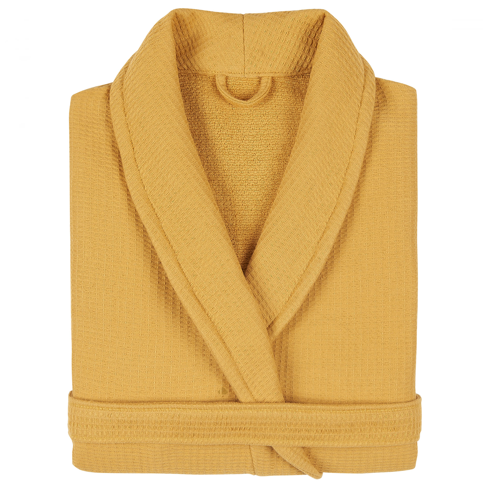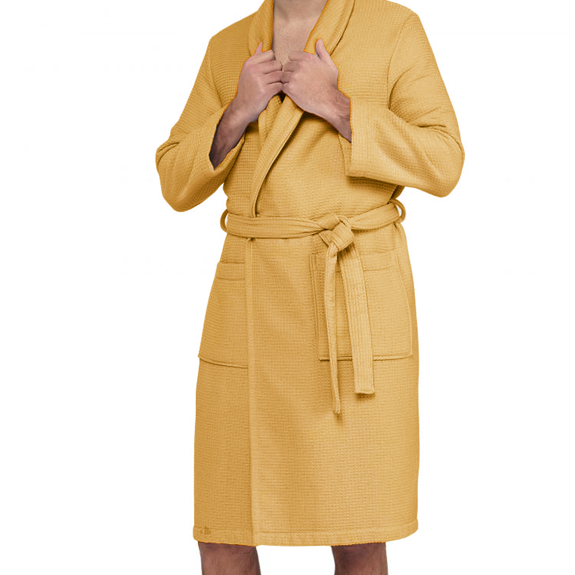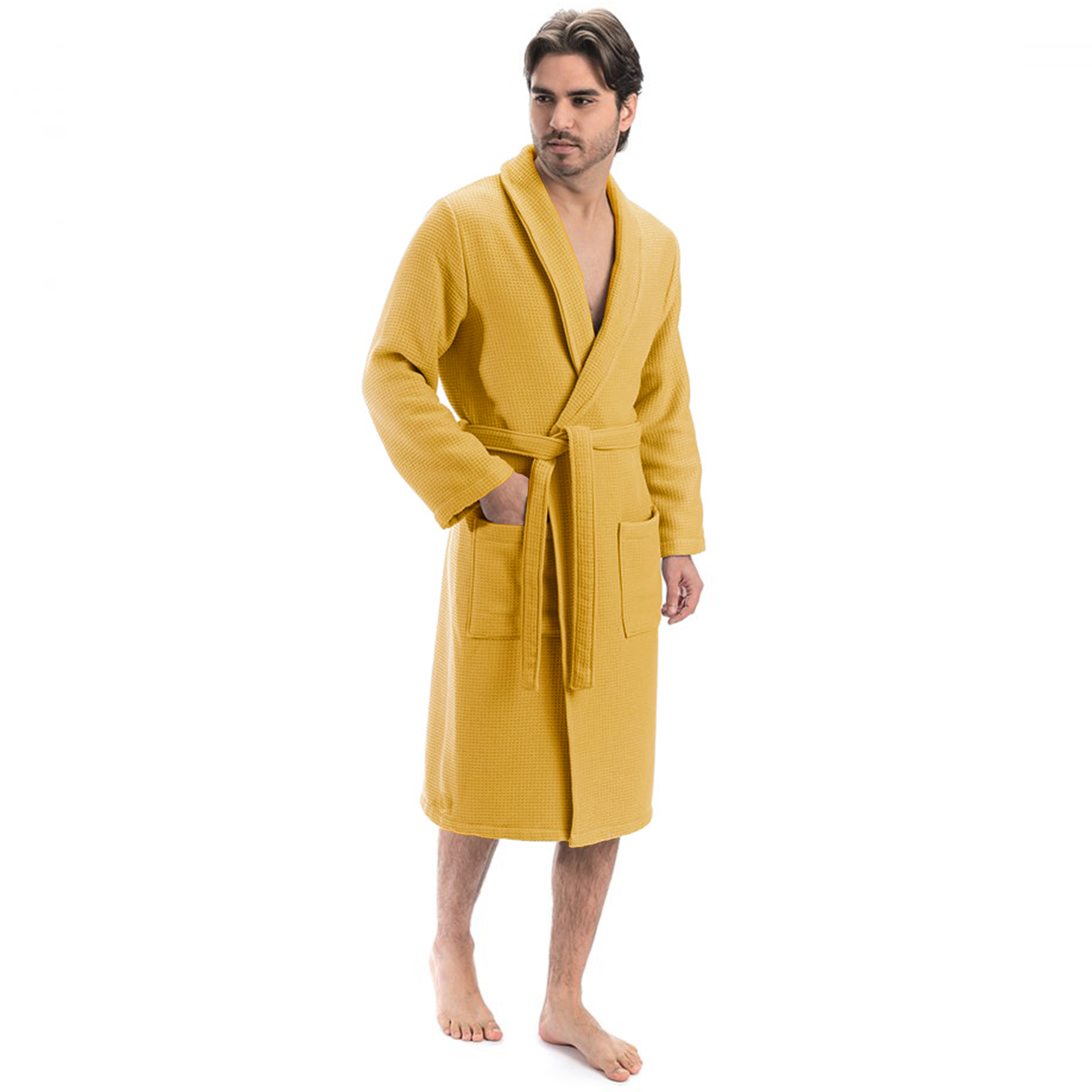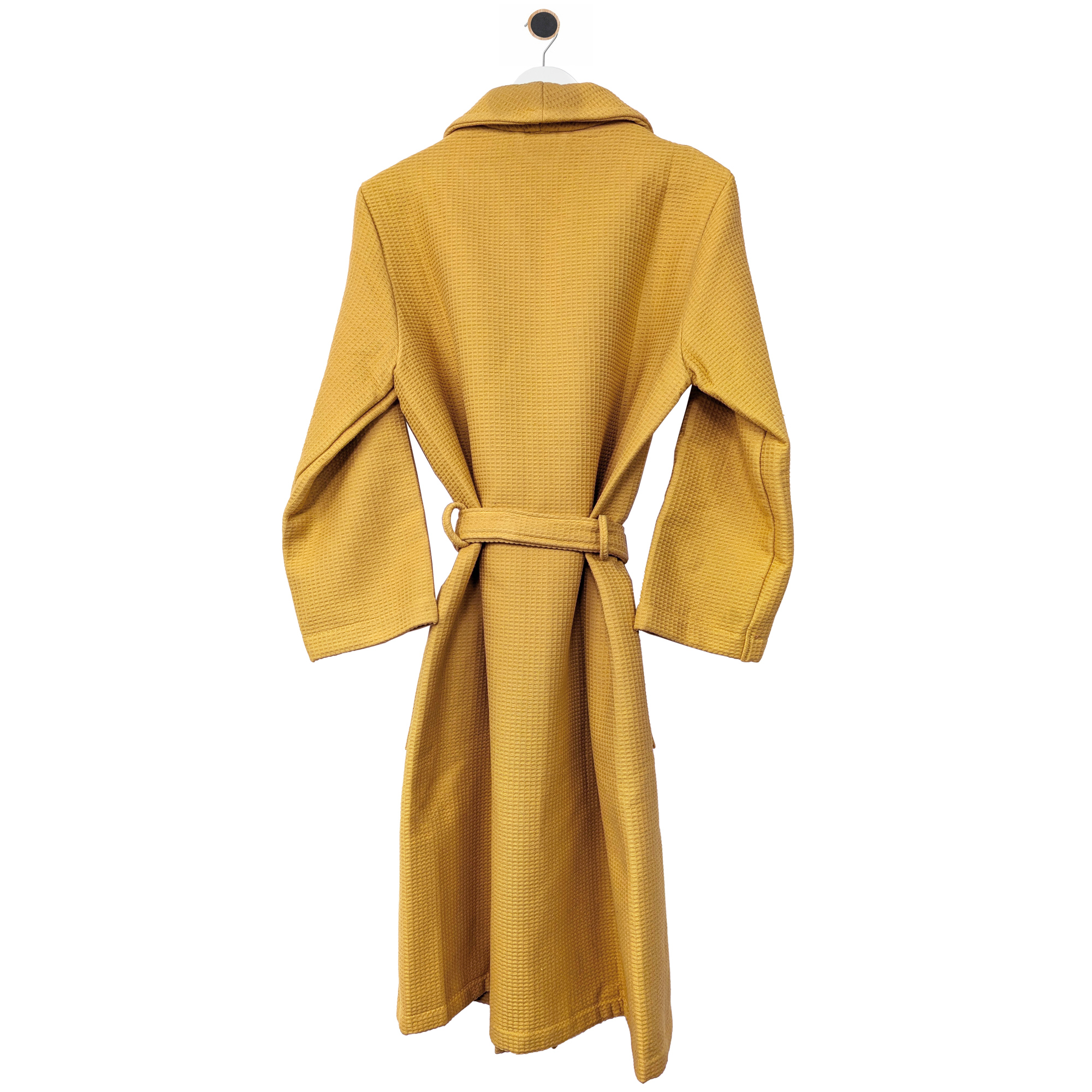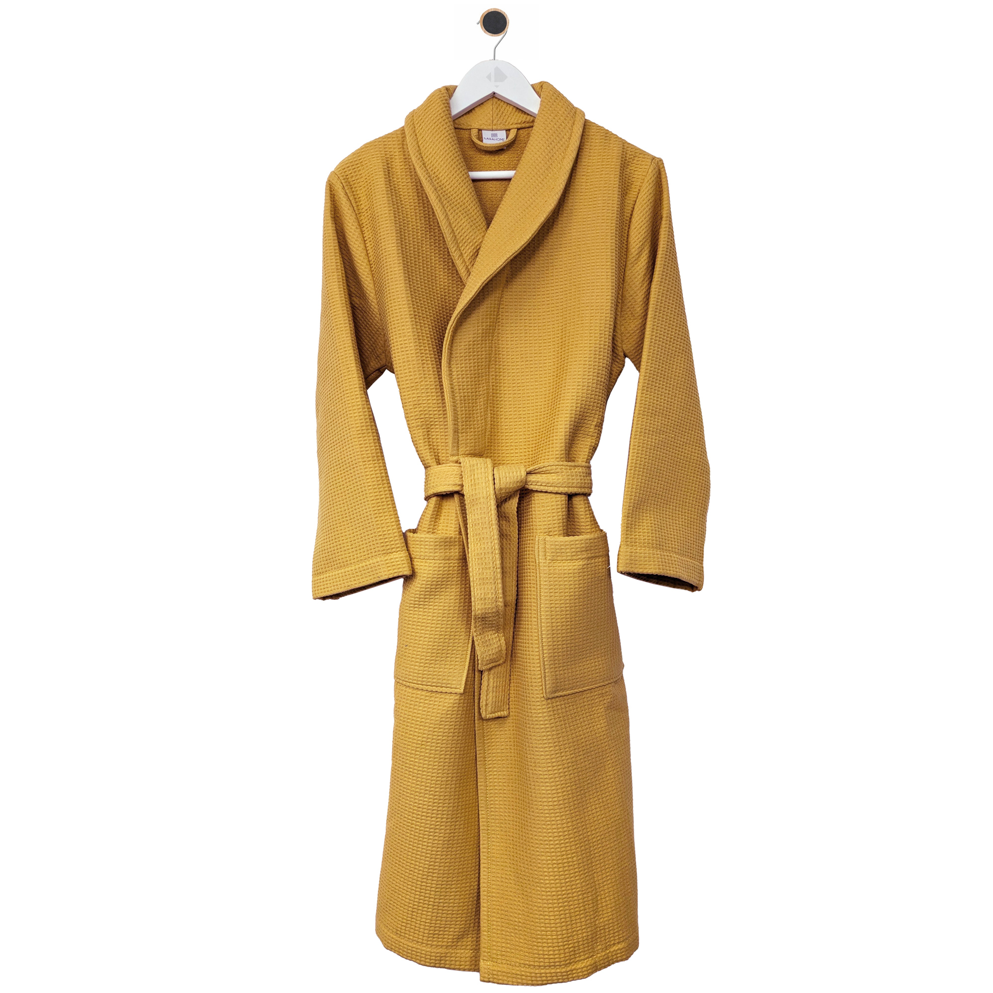 Un peignoir adulte au style épuré, en pur coton bio Gots, éponge aspect nid d'abeille et une face intérieure bouclette éponge. Collection unisexe de peignoirs de bain avec un col châle, collection NATURAL, dans un coloris jaune Curry uni, un grammage de 400 g/m2 et une finition ourlet piqué.