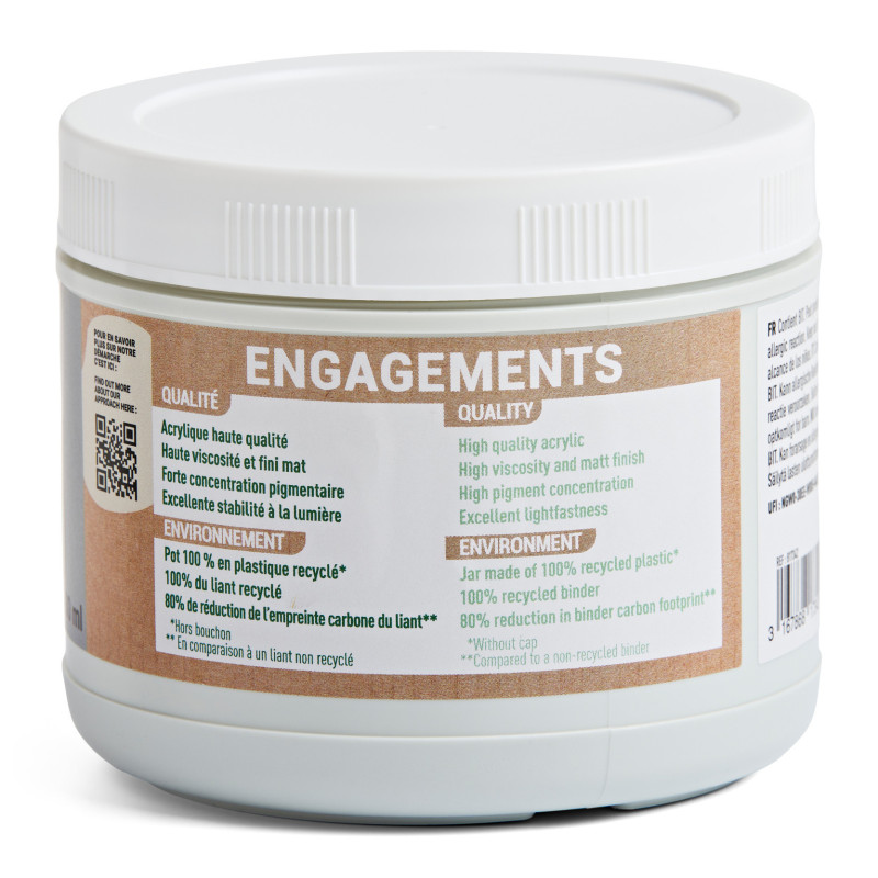 - Eco-conçue : Formulée à partir d'un liant 100% recyclé, cette peinture réduit de 80% l'empreinte carbone par rapport à un liant classique. Conditionnée dans un éco-tube en papier-PE certifié FSC®, diminuant de 59% la quantité de plastique.