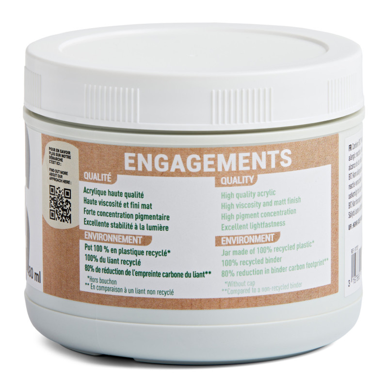En choisissant cette gamme éco-conçue, vous contribuez à la réduction des déchets plastiques et à la promotion de pratiques durables. Adaptée à divers supports comme la toile, le carton, le bois, le métal, le papier, le plâtre et la pierre. Parfaite pour diverses techniques artistiques.