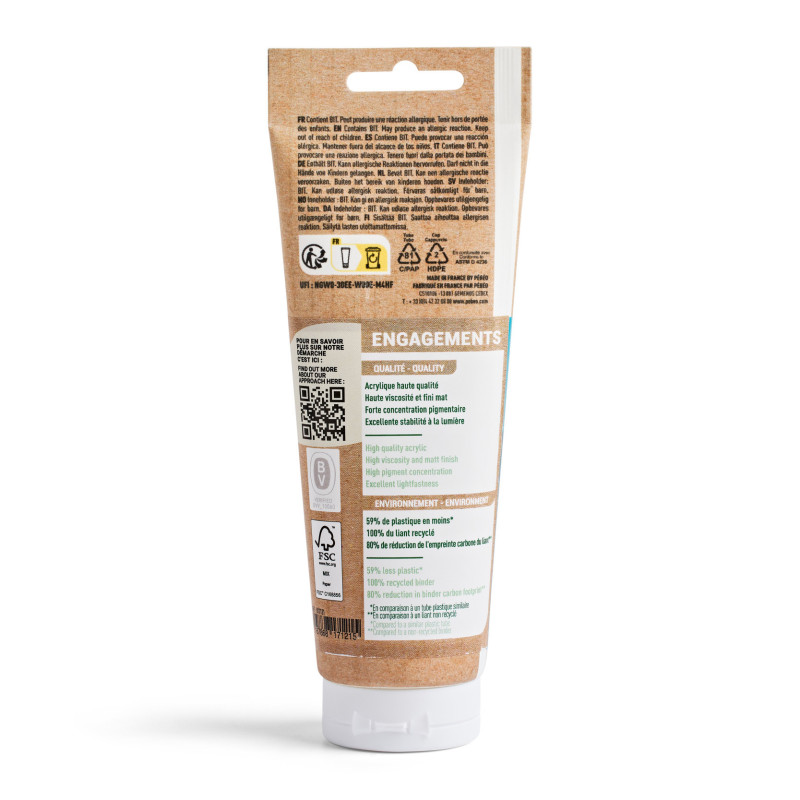 - Eco-conçue : Formulée à partir d'un liant 100% recyclé, cette peinture réduit de 80% l'empreinte carbone par rapport à un liant classique. Conditionnée dans un éco-tube en papier-PE certifié FSC®, diminuant de 59% la quantité de plastique.