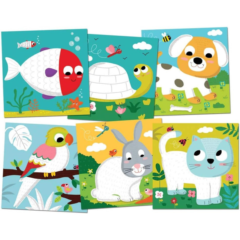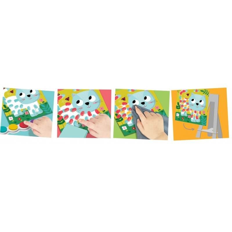 Le coffret contient 6 cartes avec différents animaux (Poisson - tortue - chien - oiseau - lapin - chat ) et 4 encreurs de peinture à doigt de 4 couleurs différentes ainsi qu'un chevalet.