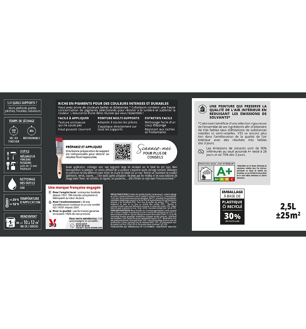 Peinture de finition riche en pigments pour des couleurs intenses et durables. Colorissim contient une haute concentration de pigments sélectionnés pour résister à la lumière et sublimer la couleur. Colorissim est une peinture qui préserve la qualité de l'air intérieur en réduisant les émissions de solvants.