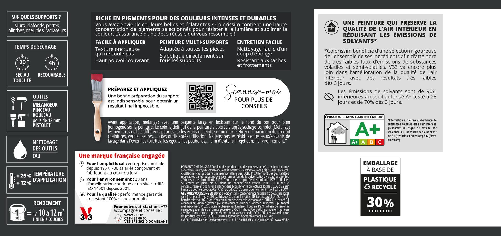 Peinture de finition riche en pigments pour des couleurs intenses et durables. Colorissim contient une haute concentration de pigments sélectionnés pour résister à la lumière et sublimer la couleur. Colorissim est une peinture qui préserve la qualité de l'air intérieur en réduisant les émissions de solvants.