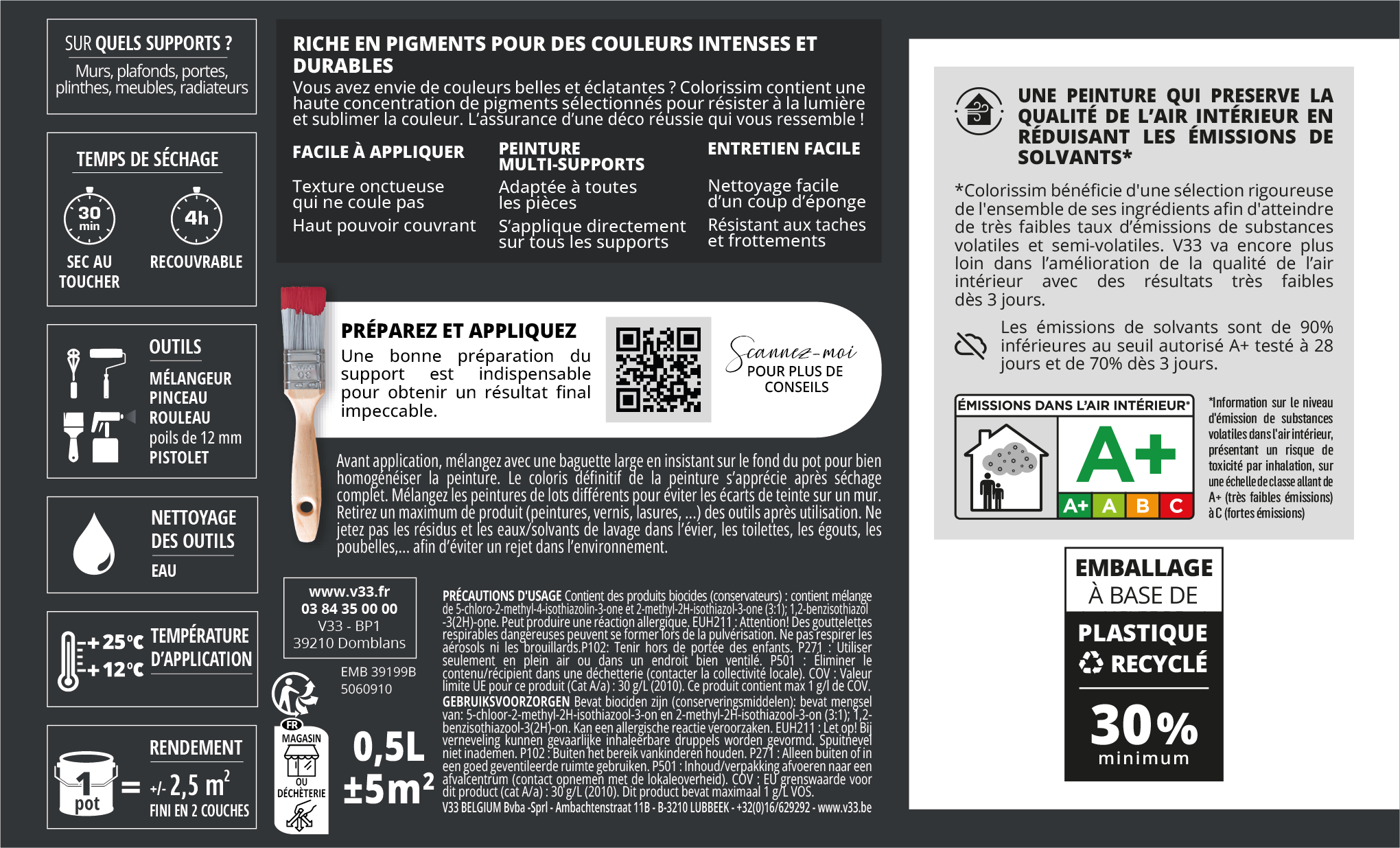 Peinture de finition riche en pigments pour des couleurs intenses et durables. colorissim contient une haute concentration de pigments sélectionnés pour résister à la lumière et sublimer la couleur. colorissim est une peinture qui préserve la qualité de l'air intérieur en réduisant les émissions de solvants.
