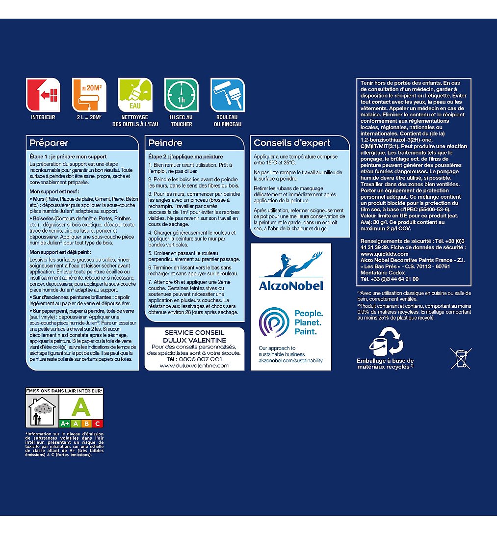 Vous rêvez d'un mur qui résiste aux agressions fréquentes et qui garde sa couleur éclatante dans le temps ? La peinture Crème de Couleur Cuisine & Bain de Dulux Valentine a été spécialement conçue pour résister aux projections d'eau, à l'humidité, à la moisissure et aux taches tenaces (boissons, vin, sauce, graisses, colorants, maquillage, calcaire…) que peuvent subir votre cuisine et votre salle de bain au quotidien. Votre peinture, une fois sèche, possède un film résistant qui protègera vos murs durablement. Sa texture crémeuse facilite son application, limite les coulures et les éclaboussures. Elle est idéale pour décorer les murs, plafonds, portes, plinthes de vos pièces humides.