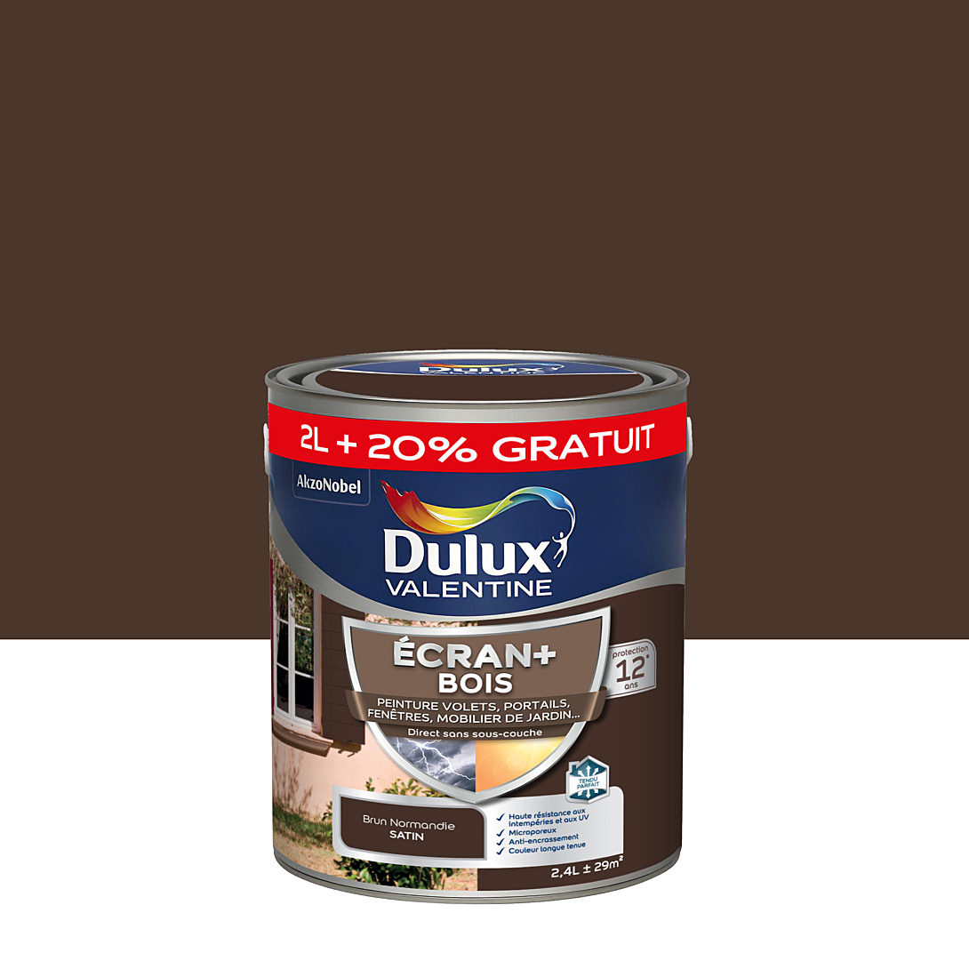 | Libellé | Peinture Ecran+ Bois Extérieur Satin Dulux Valentine Brun Normandie 2 L + 20% gratuit |