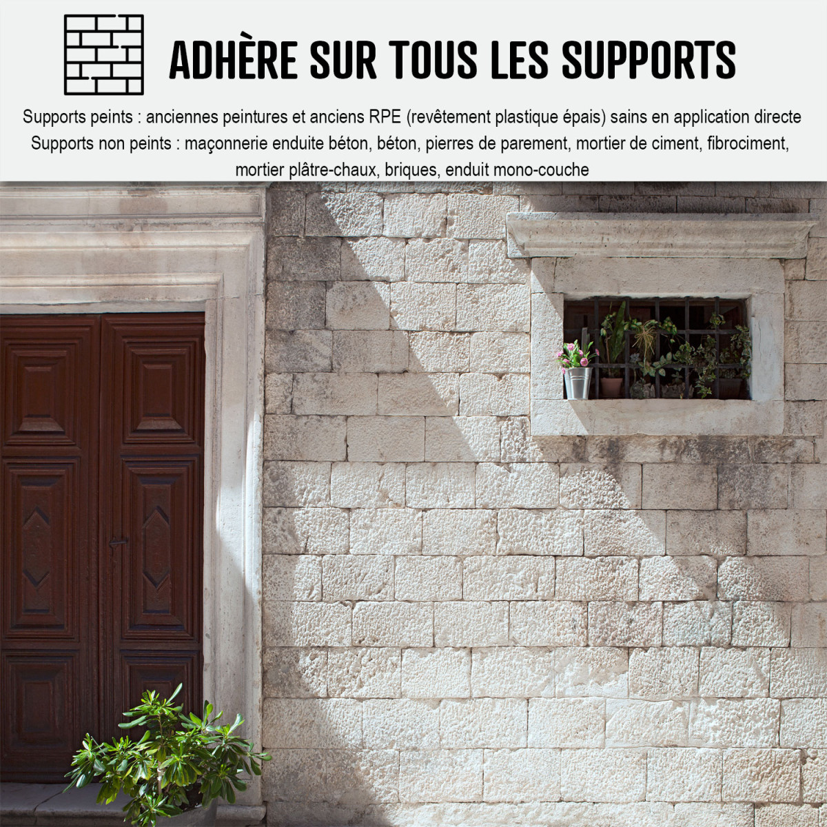 - Supports non peints : maçonnerie enduite béton, béton, pierres de parement, mortier de ciment, fibrociment, mortier plâtre-chaux, briques, enduit mono-couche.