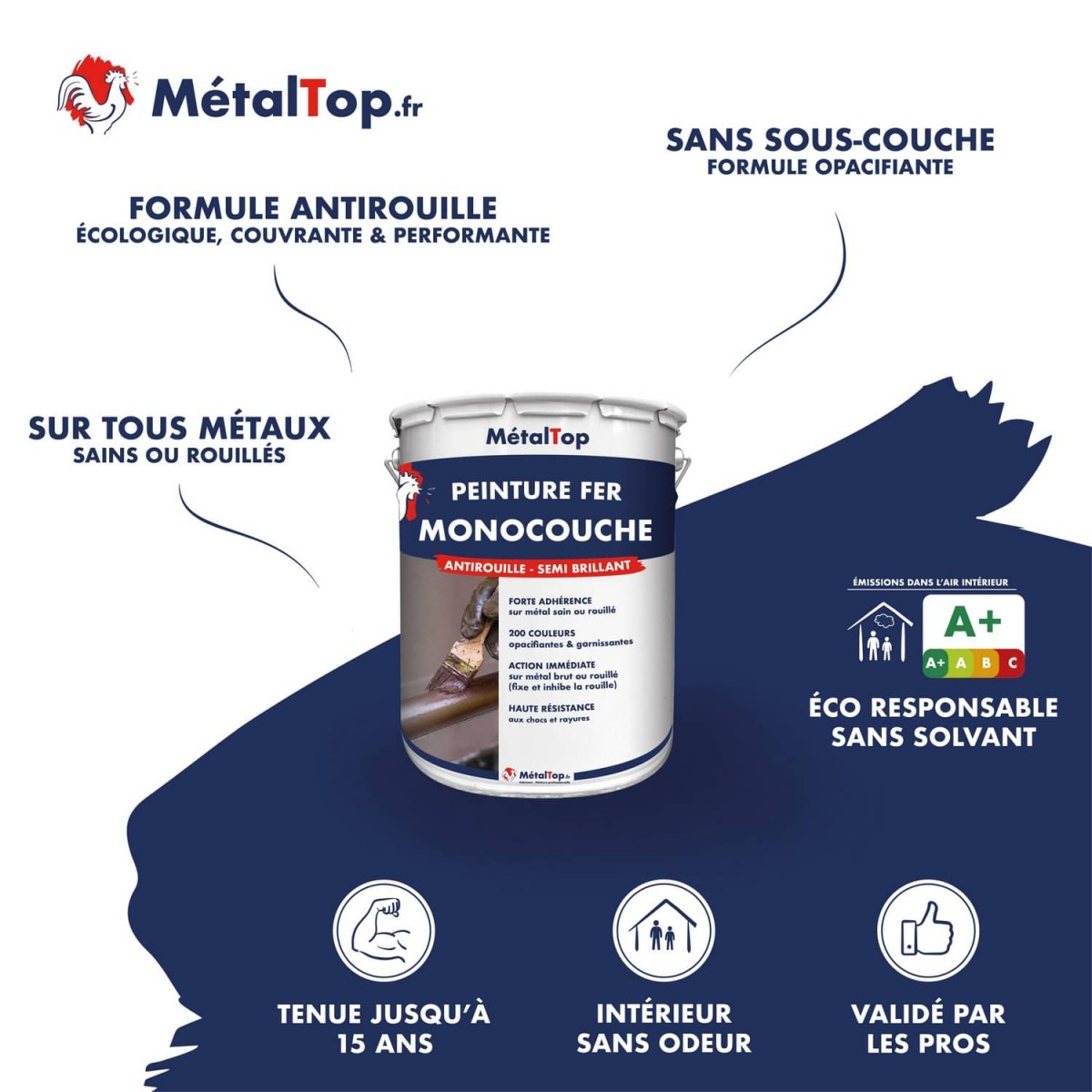 Peinture fer monocouche antirouille, semi brillante, pour rénover vos métaux en une application.