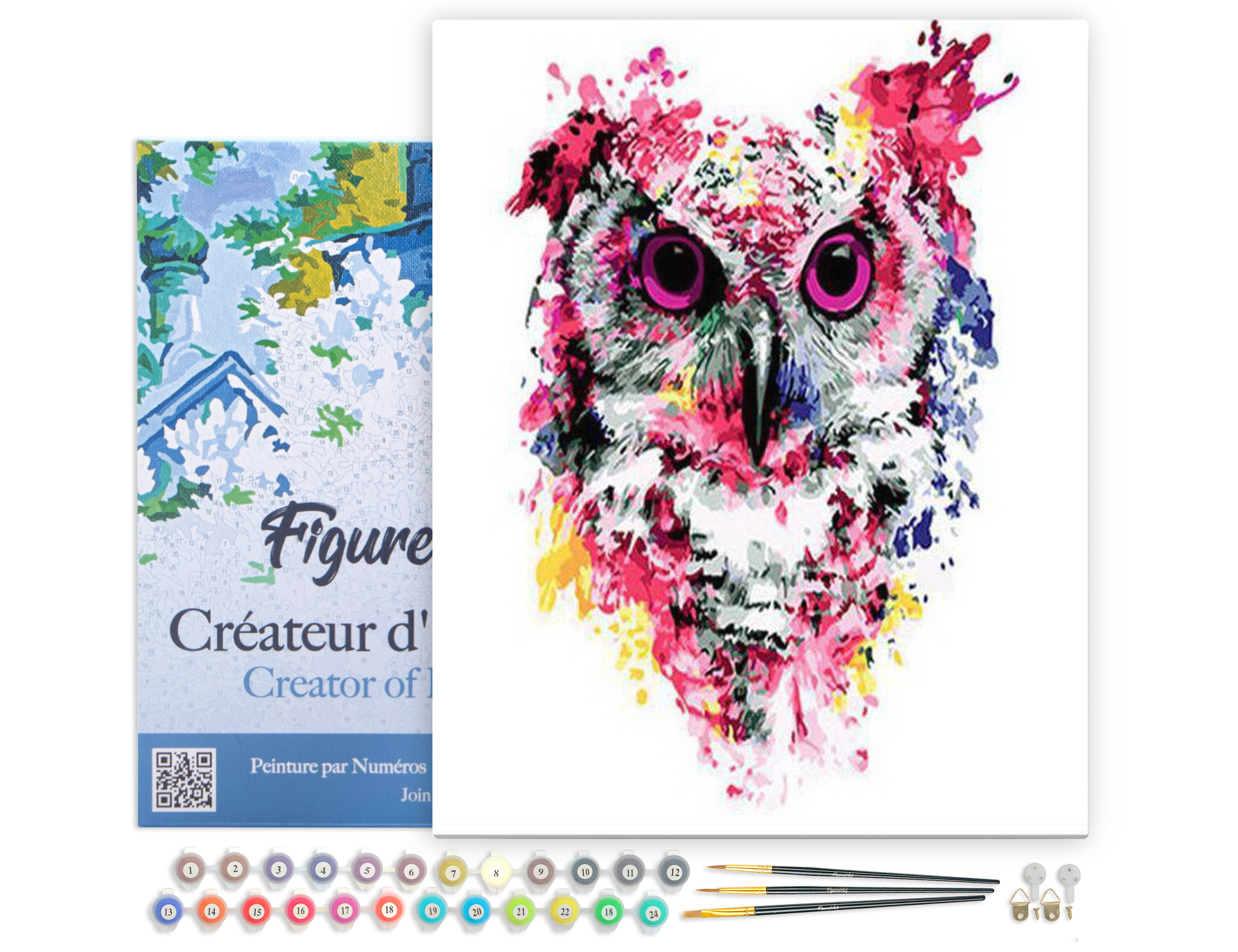 Peinture par Numéro Figured'Art avec Cadre - Chouette rose moderne - Kit de Loisir Créatif DIY Numéro d'A