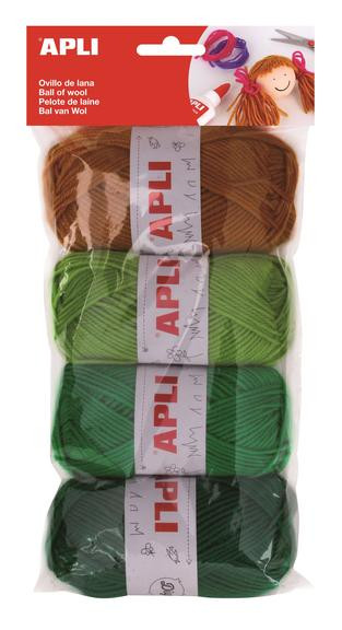 Pelotes de laine 100 % acrylique de différentes nuances de vert et couleurs assorties : vert foncé, vert gazon, vert clair et caramel. Chaque paquet inclut 4 Pelotes de 50 g chacune (environ 90 m).