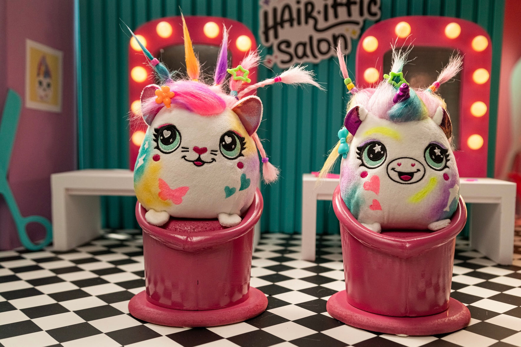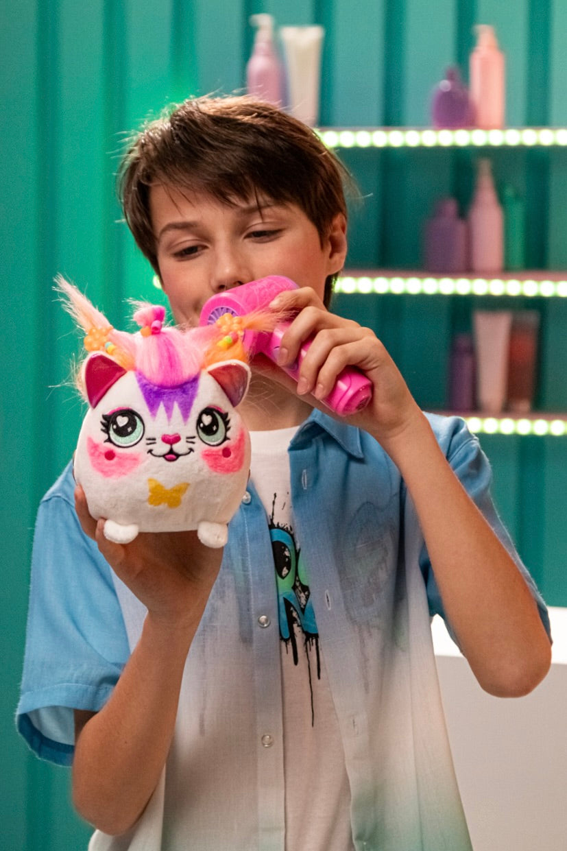 Amuse-toi à personnaliser ta peluche à l'aide de ton spray, de tes feutres et de tes pochoirs. Coiffe les cheveux de ta peluche de façon amusante avec les accessoires inclus. Lave ta peluche et recommence à l'infini ! 2 personnages à collectionner !