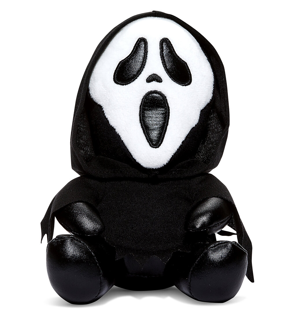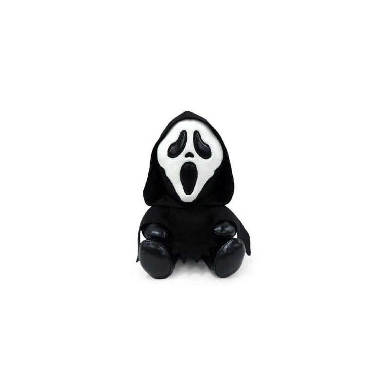 Peluche Scream Ghostface. Corps de la peluche noir et vernis. Cape avec capuche.