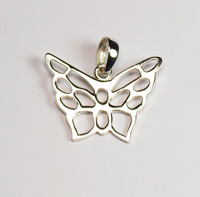 Pendentif forme papillon en argent. Le papillon est stylisé. Moderne à porter avec un cordon en cuir. hauteur : 2cm - Largeur : 2,5cm - Poids : 1gr