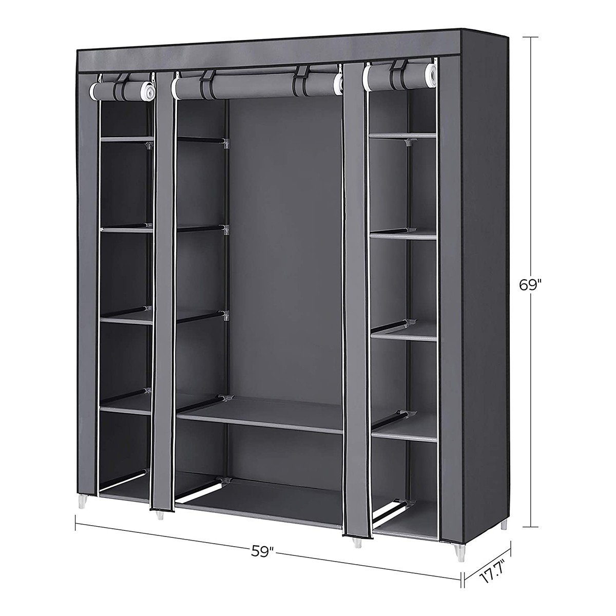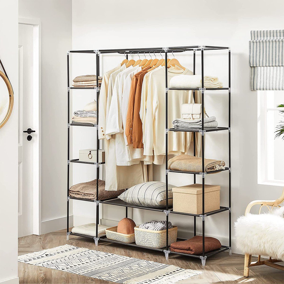- 1 tringle à vêtements amovible et 12 étagères de rangement