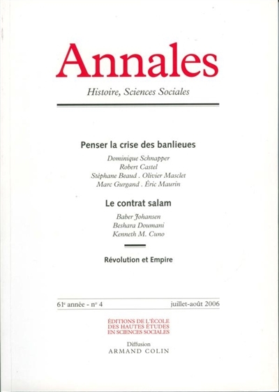 Au sommaire notamment : L'échec du "modèle républicain" ? : réflexion d'une sociologue (D. Schnapper) ; La discrimination négative : le déficit de citoyenneté des jeunes de banlieue (R. Castel) ; Des marcheurs de 1983 aux émeutiers de 2005 : deux générations sociales d'enfants d'immigrés (S. Beaud et al.). Second dossier : Le contrat salam (B. Johansen, B. Doumani, K. M. Cuno).