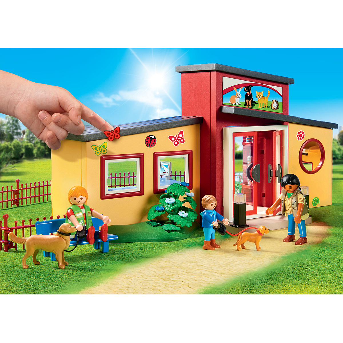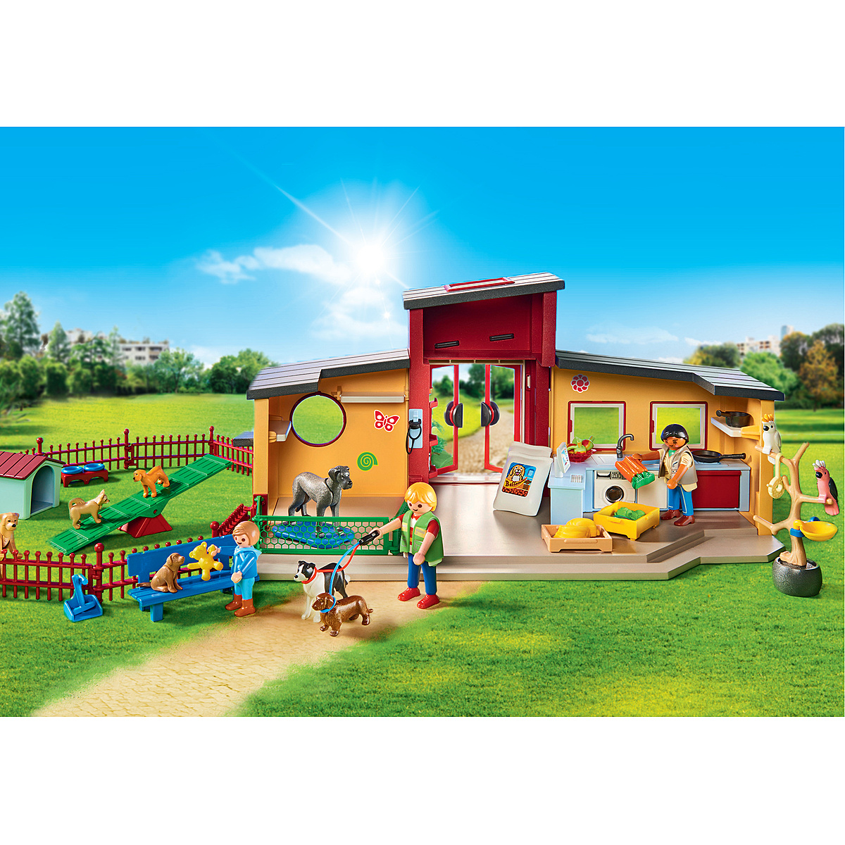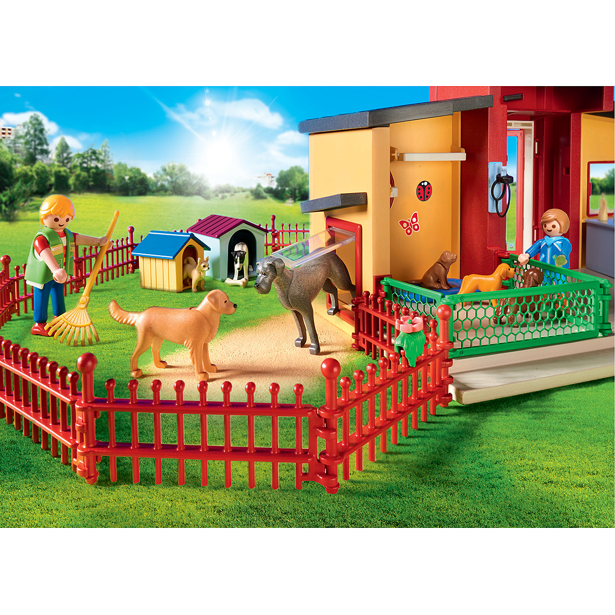 C'est l'heure de manger ! Les trois soigneurs arrivent avec des gamelles bien remplies. Les huit chiens de la pension des animaux se précipitent pour être les premiers à savourer leurs croquettes. Les deux perroquets attendent patiemment qu'on leur serve à eux aussi leur dîner. La pension est bien équipée pour accueillir tout ce petit monde : une grande cuisine, une réception, un enclos intérieur et un grand parc à clôtures modulables. Le jardin comprend deux niches et une balançoire permettant aux chiens de jouer ou de se reposer. Dimensions : 76 x 24 x 19 cm (LxPxH).