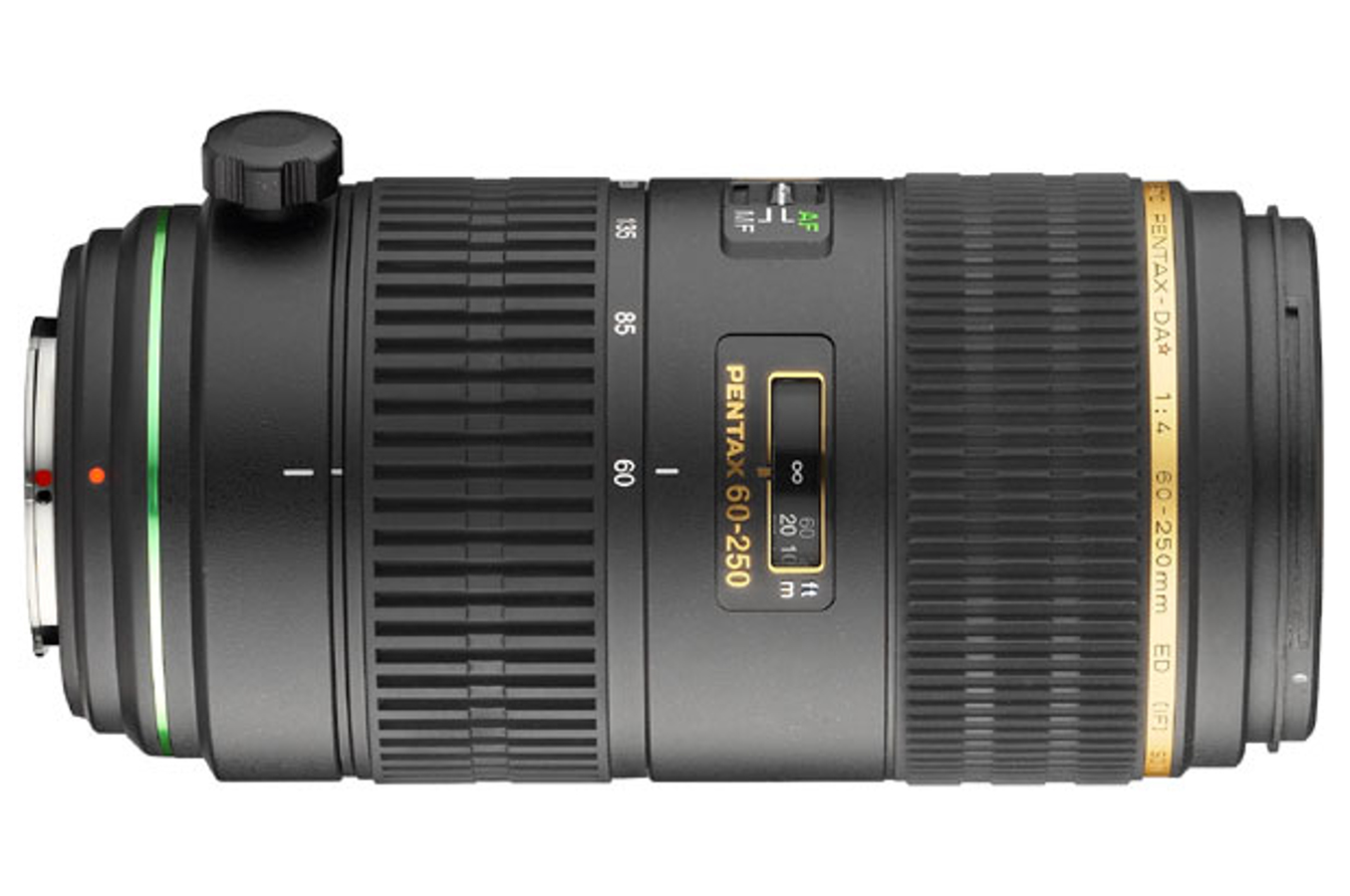 Pentax smc DA 60-250 / 4,0 (IF) SDM. Distance minimale de mise au point: 1,1 m, Angle de vue de l’objectif, diagonal: 26.5°, Longueur focale: 60 - 250 mm. Compatibilité: K10D K100D. Matériel: Métal, Couleur du produit: Noir. Diamètre: 8,2 cm, Taille de filtre: 6,7 cm, Longueur du produit: 167,5 mm. Agrandissement: 0,15x