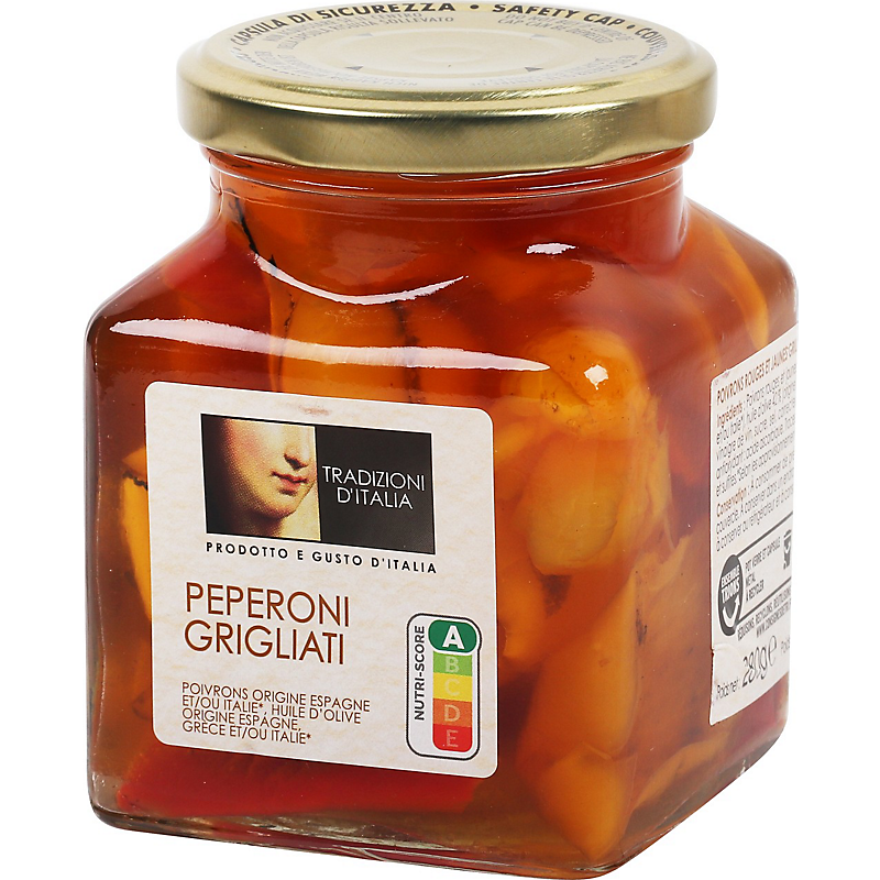 Ingrédients : Poivrons rouges et jaunes grillés 52 %, huile d'olive 42,8 %, vinaigre de vin, sucre, sel, correcteur d’acidité : acide citrique, antioxydant : acide ascorbique.
