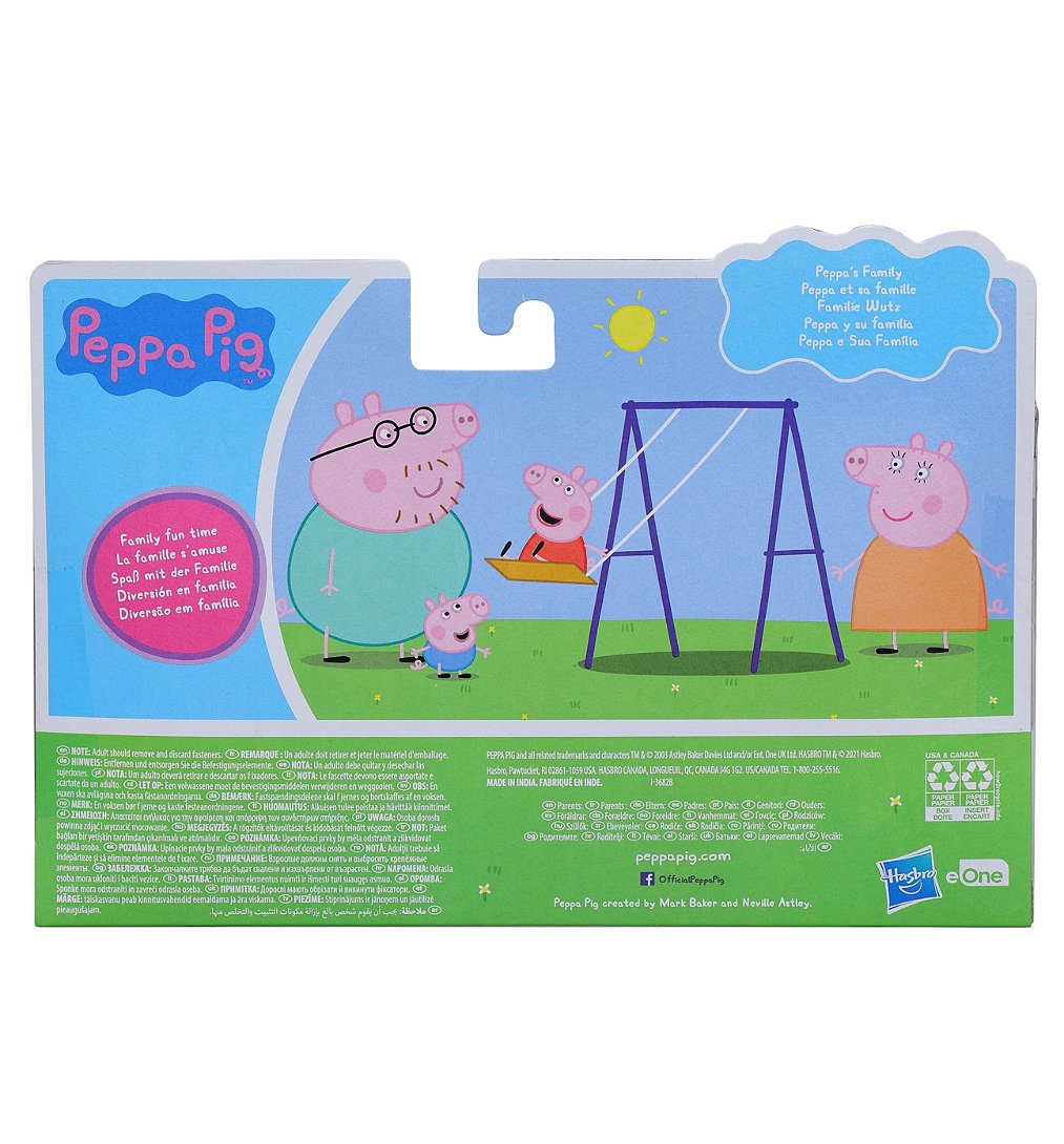 On part à la rencontre de Peppa Pig et sa famille, Maman Pig, Papa Pig et George Pig, le petit frère ! Ce pack contient 4 figurines classiques inspirées des personnages célèbres du dessin animé d'Entertainment One Peppa Pig. Les enfants peuvent imaginer leurs propres aventures familiales ou recréer leurs moments préférés du dessin animé. La gamme inclut aussi L'heure du dodo et Jouons sous la pluie (vendus séparément, dans la limite des stocks), pour d'autres moments amusants avec la famille Pig. Dès 3 ans. Copyright 2021 ABD Ltd/Ent. One UK Ltd. Hasbro et tous les termes associés sont des marques de commerce de Hasbro.